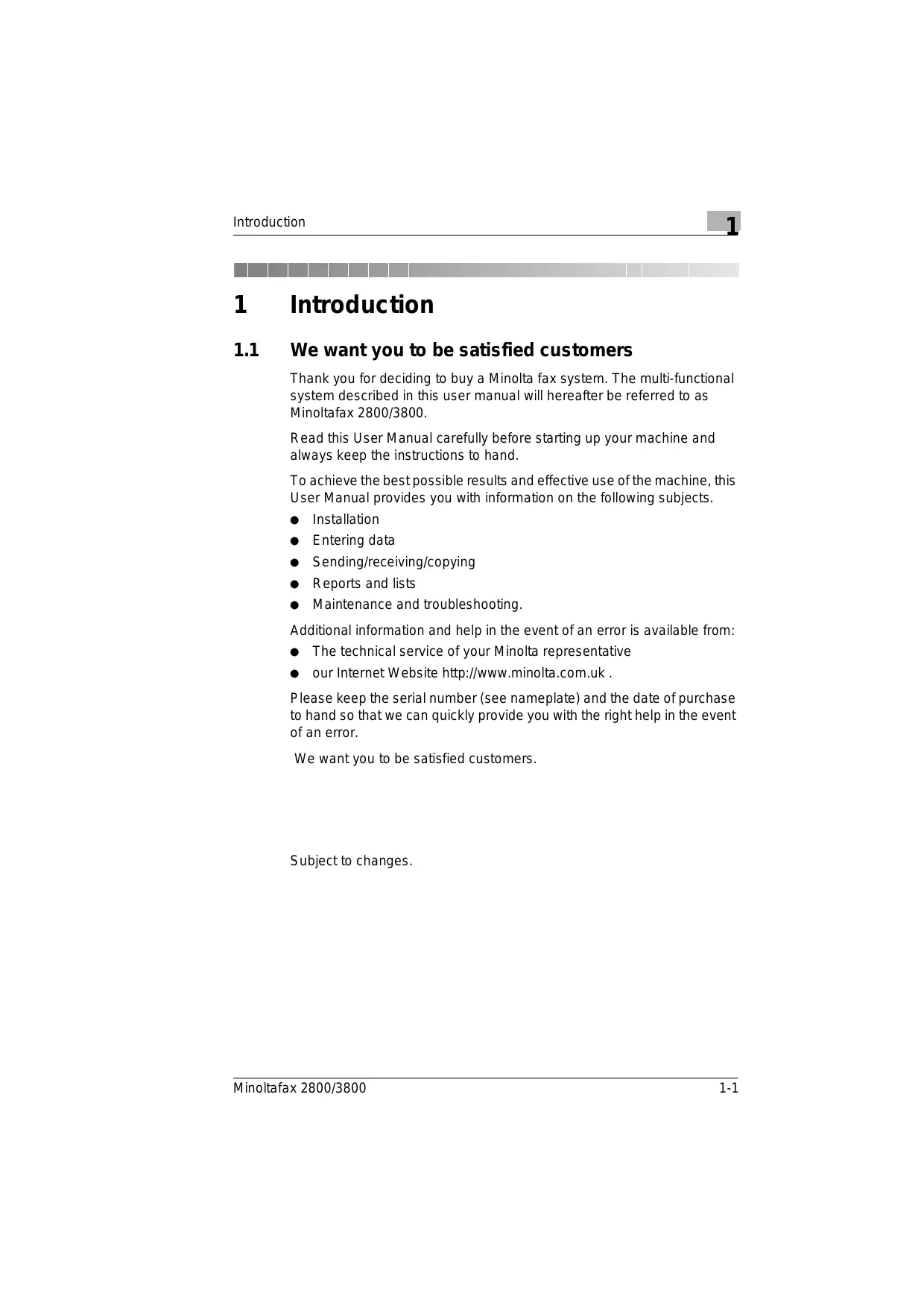 Introduction We want you to be satisfied customers Thank you for deciding to buy a Minolta fax system. The multi-functional system described in this user manual will hereafter be referred to as Minoltafax 2800/3800. Read this User Manual carefully before starting up your machine and always keep the instructions to hand. To achieve the best possible results and effective use ofthe machine, this User Manual provides you with information on the following subjects. e Installation Entering data Sending/receiving/copying Reports and lists Maintenance and troubleshooting. Additional information and help in the event of an error is available from: e The technical service of your Minolta representative e our internet Website http://www.minolta.com.uk Please keep the serial number (see nameplate) and the date of purchase to hand so that we can quickly provide you with the right help in the event of an error. We want you to be satisfied customers. Subject to changes Minoltafax 2800/3800 1-1