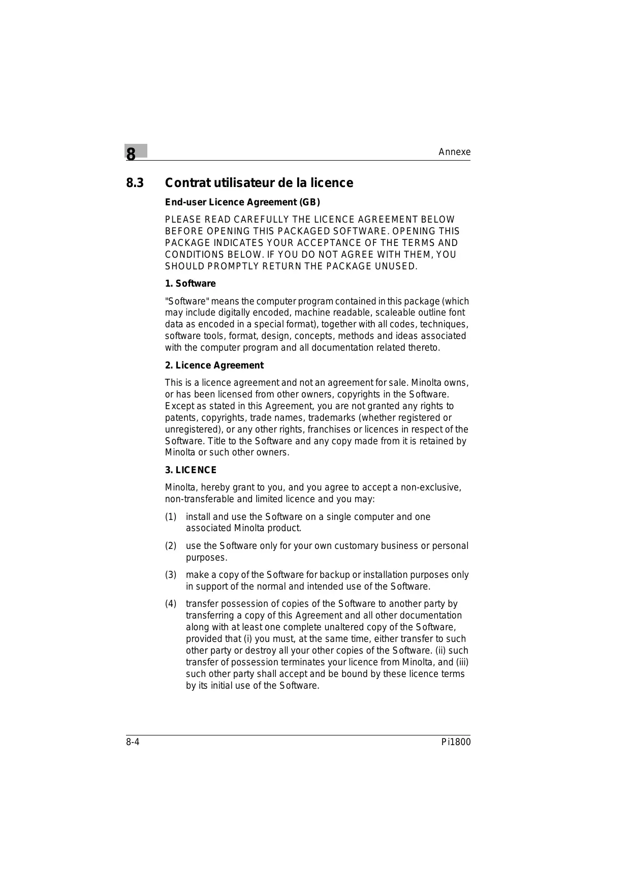Minolta, hereby grant to you, and you agree to accept a non-exclusive, non-transferable and limited licence and you may: (1) install and use the Software on a single computer and one associated Minolta product. (2) use the Software only for your own customary business or personal purposes. (3) make a copy of the Software for backup or installation purposes only in support of the normal and intended use of the Software. (4) transfer possession of copies of the Software to another party by transferring a copy of this Agreement and all other documentation along with at least one complete unaltered copy of the Software, provided that (i) you must, at the same time, either transfer to such other party or destroy all your other copies of the Software. (ii) such transfer of possession terminates your licence from Minolta, and (iii) such other party shall accept and be bound by these licence terms by its initial use of the Software. 8-4 Pi1800