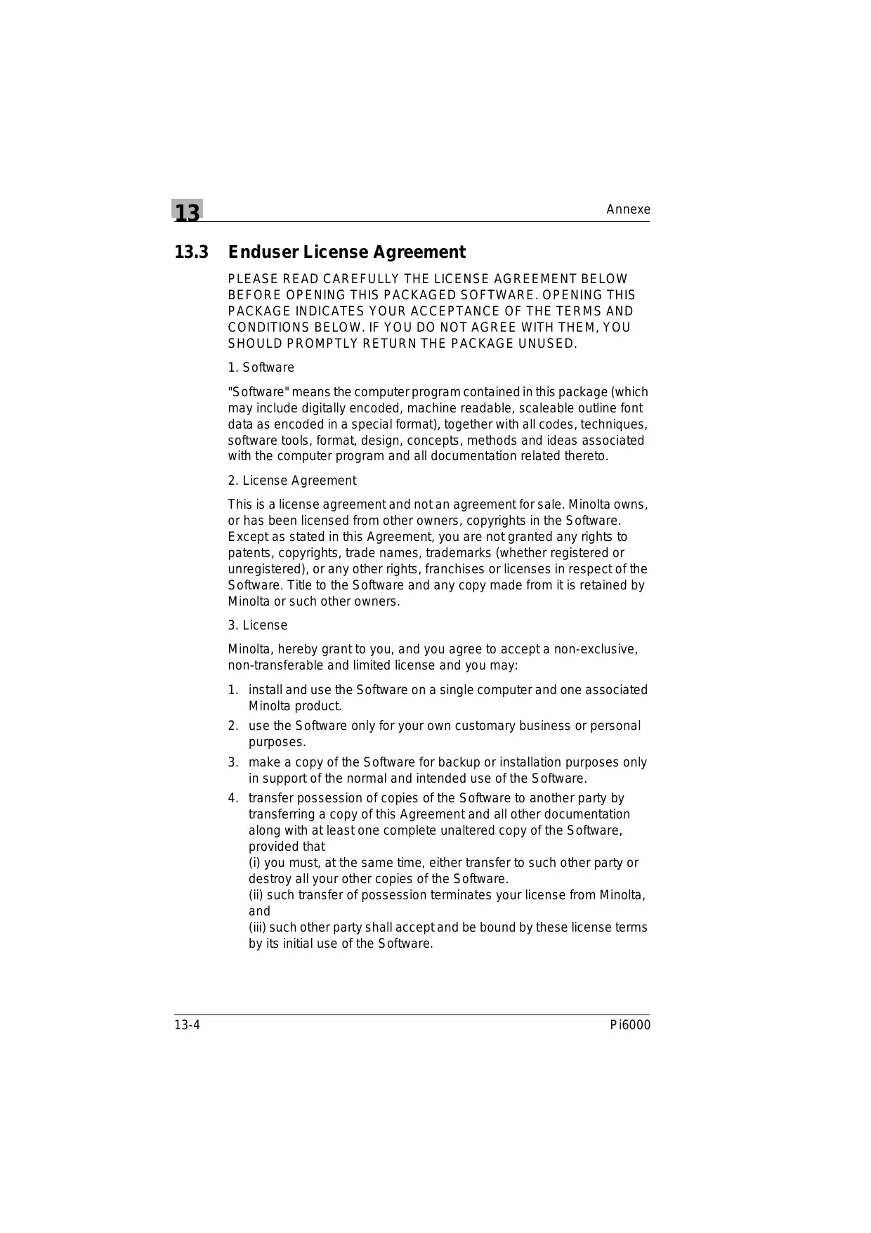 transferring a copy of this Agreement and all other documentation along with at least one complete unaltered copy of the Software, provided that (i) you must, at the same time, either transfer to such other party or destroy all your other copies of the Software. (ii) such transfer of possession terminates your license from Minolta, and (iii) such other party shall accept and be bound by these license terms by its initial use of the Software. 13-4 Pi6000 Annexe