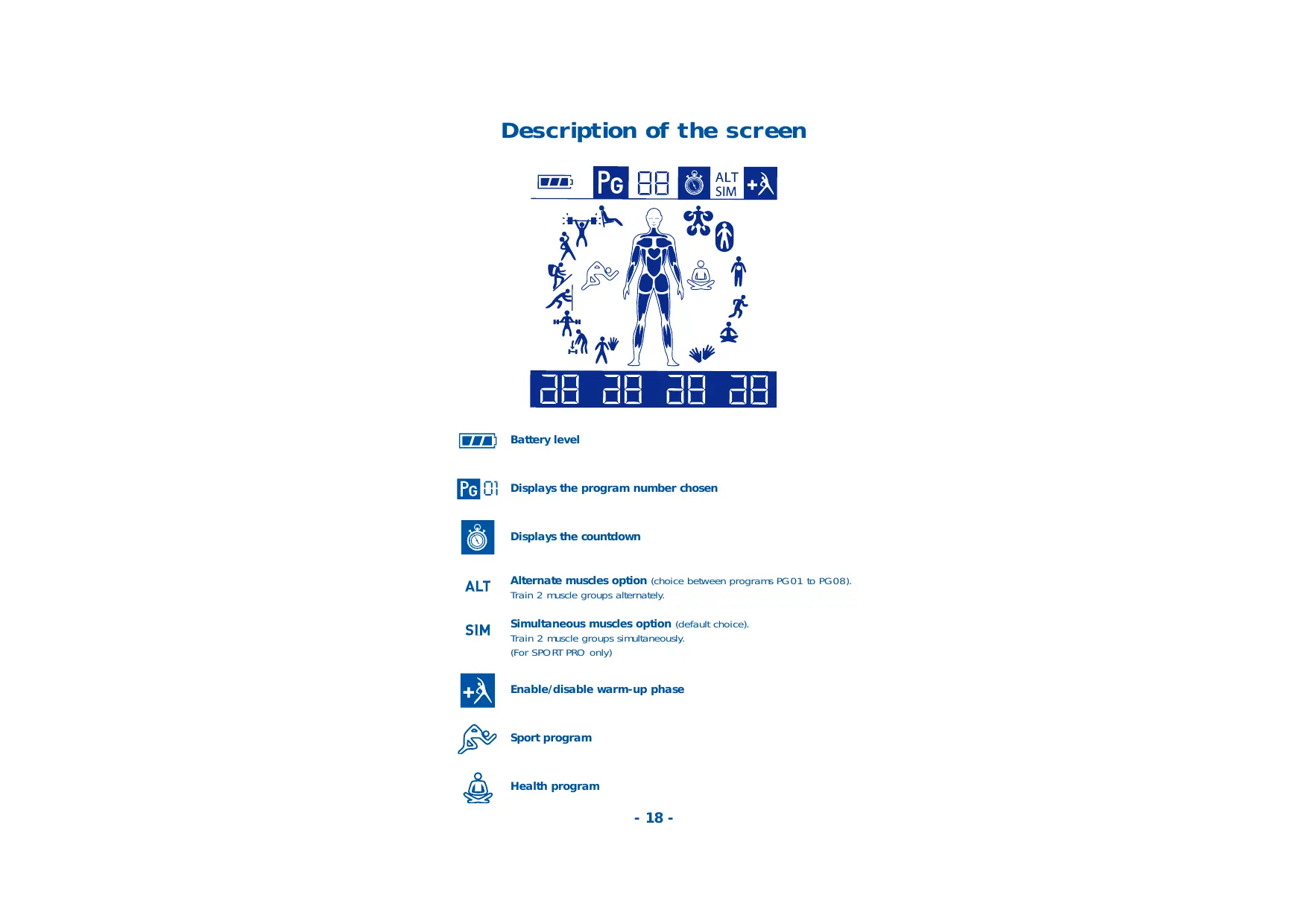 Displays the program number chosen Displays the countdown Alternate muscles option (choice between programs PG01 to PG08). Train 2 muscle groups alternately. Simultaneous muscles option (default choice). Train 2 muscle groups simultaneously. (For SPORT PRO only) Enable/disable warm-up phase Sport program Health program