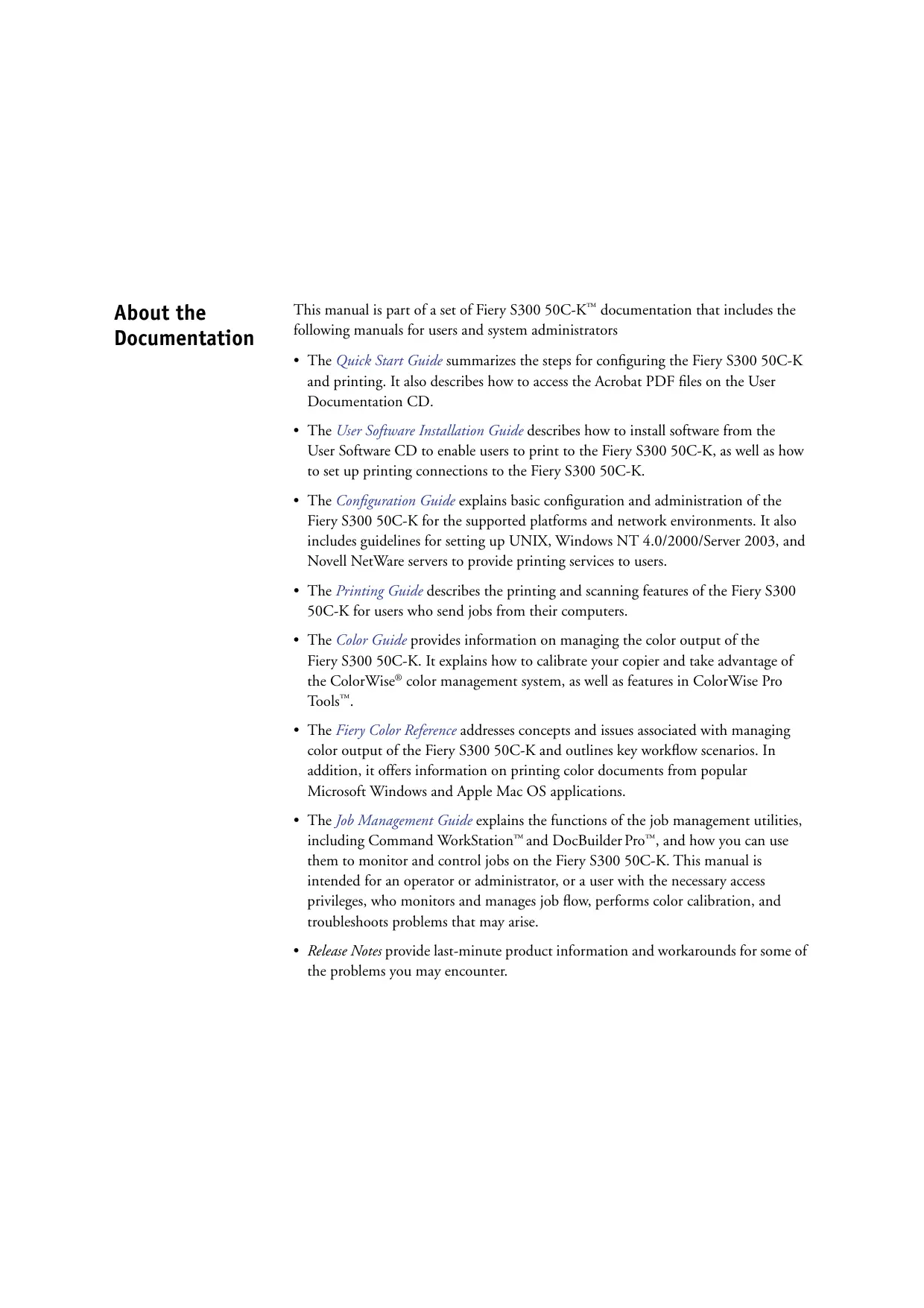 About the Documentation This manual is part of a set of Fiery S300 50C-K°* documentation that includes the following manuals for users and system administrators The Quick Start Guide sammarizes the steps for configuring the Fiery S300 50C-K and printing, Ir also describes how to access the Acrobat PDF files on the User Documentation CD. The Uier Sofnvare Installation Guide describes how to install software from the User Software CD to enable users to print to the Fiery S300 50C-K, as well as how to set up printing connections to the Fiery $300 50C-K. The Configuration Guide explains basic configuration and administration of the Fiery 8300 50C-K for the supported platforms and network environments. It also includes guidelines for setting up UNIX, Windows NT 4.0/2000/Server 2003, and Novell NetWare servers to provide printing services to users. The Printing Guide describes the printing and scanning features of the Fiery S300 50C-K for users who send jobs from their computers. The Color Guide provides information on managing the color output of the Fiery 8300 50C-K. It explains how to calibrate your copier and take advantage of the ColorWise® color management system, as well as features in Color Wise Pro Tools”. The Fiery Color Reference addresses concepts and issues associated with managing color output of the Fiery S300 50C-K and outlines key workflow scenarios. In addition, it offers information on printing color documents from popular Microsoft Windows and Apple Mac OS applications. The Job Management Guide explains the functions of the job management utilities, including Command WorkStation"" and DocBuilder Pro" them to monitor and control jobs on the Fiery 8300 50C-K. This manual is intended for an operator or administrator, or a user with the necessary access privileges, who monitors and manages job flow, performs color calibration, and , and how you can use troubleshoots problems that may arise. Release Notes provide last-minute product information and workarounds for some of the problems you may encounter.