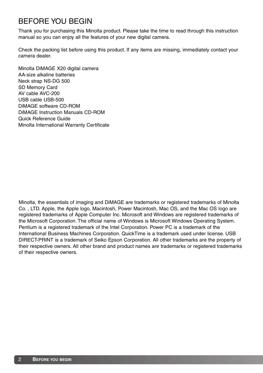 Download the instructions for your Appareil photo numérique in PDF format for free! Find your manual DIMAGE X20 - KONICA MINOLTA and take your electronic device back in hand. On this page are published all the documents necessary for the use of your device. DIMAGE X20 by KONICA MINOLTA.