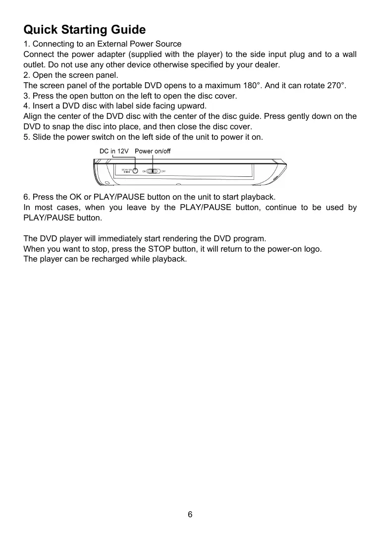 In most cases, when you leave by the PLAY/PAUSE button, continue to be used by PLAY/PAUSE button. The DVD player will immediately start rendering the DVD program. When you want to stop, press the STOP button, it will return to the power-on logo. The player can be recharged while playback.