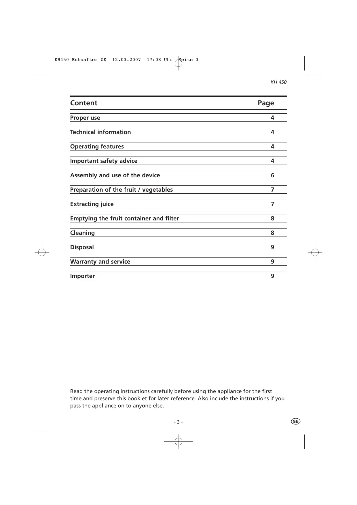 KH 450 ee Content Page Proper use 4 Technical information 4 Operating features 4 Important safety advice 4 Assembly and use of the device 6 Preparation of the fruit / vegetables 7 Extracting juice 7 Emptying the fruit container and filter 8 Cleaning 8 Disposal 9 À Warranty and service 9 Importer 9 Read the operating instructions carefully before using the appliance for the first time and preserve this booklet for later reference. Also include the instructions if you pass the appliance on to anyone else.
