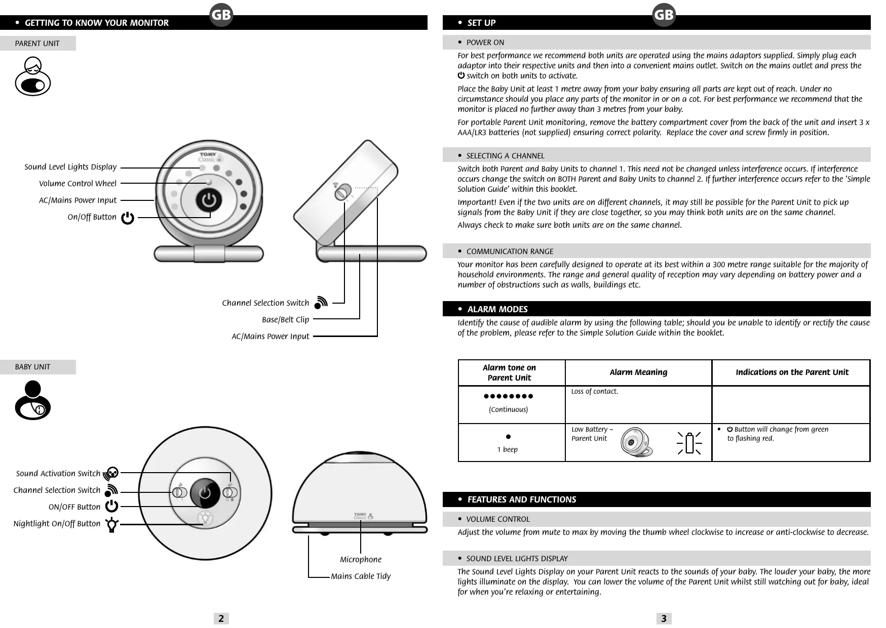 The Tomy Baby Monitor is designed to help you monitor your child and is not a substitute for adult supervision. This product is not a toy. Your monitor transmits over public airwaves. Your conversation maybe heard by another product that operates on the same frequency. Always keep electrically operated items and their cables out of reach of babies and younger children. Under no circumstances should you place any part of your monitor in or on a cot. Ensure all wiring is positioned safely so that children cannot become entangled and that no trip hazard is created. Under no circumstances should the adaptors supplied with this monitor be used with any other equipment. No other adaptors than those supplied should be used with your monitor. Be careful not to position the adaptor where a child is likely to use it as a step. Putting weight on the adaptor while it is plugged in could damage the unit or cause injury to your child. It is normal for chargers to become hot during use – take care when handling, allow heat to disperse. DO NOT COVER. Disconnect charger if the product will not be used for several days. To prevent a shock hazard, please disconnect from power supply before cleaning. Do not dispose in normal waste. Do not attempt to dismantle any part of this product.