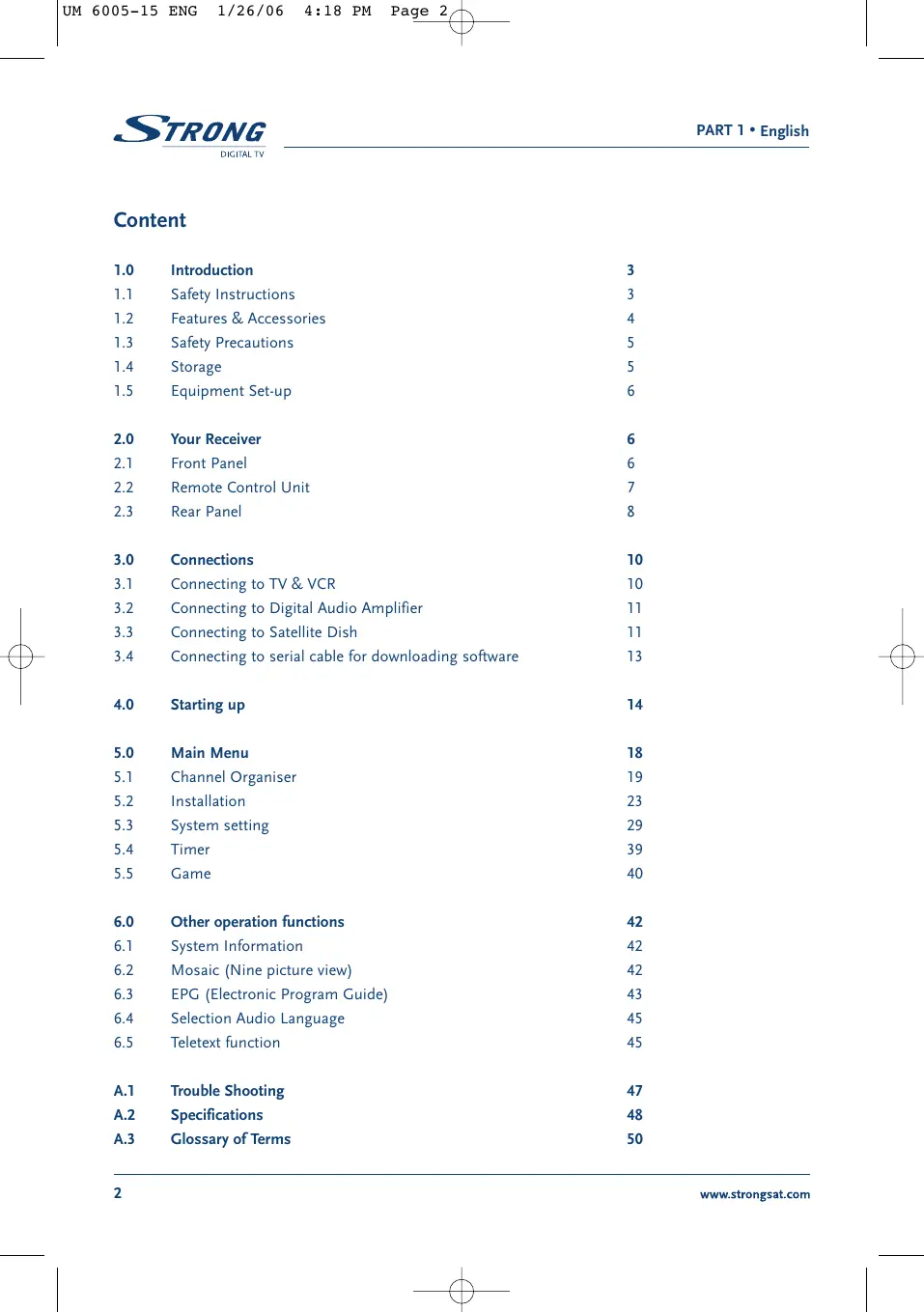 Environmental Issues Strong is committed to reducing the impact of its products on the environment. To maximise the benefits of our design enhancements, your co-operation is required. Electronic product recycling Do not dispose of this product with your domestic rubbish. At the end of its useful life, this product contains materials which when processed correctly can be recovered and recycled. By participating in the responsible recycling of this product you will be reducing the requirement for new raw materials and reducing the amount of material that would otherwise end up in landfill. When you purchase a new, similar product your retailer may offer to take this old one off you. Alternatively, you can take it to your local recycling centre. Your retailer or local municipal authority will advise you of the collection facilities available for waste electronically products in your area. User of this service will be free to you. Within the scope of the European legislation on Waste Electrical and Electronic Equipment (Directive 2002/96/EC valid as of August 2005) STRONG provides a recycling system free of charge for consumers to returning products after end of life. For more information about STRONG’s environmental policy to you: www.strongsat.com - select “About us” and “Environmental Policy“ from the submenu. Packaging When disposing of this product packaging, please ensure that it is recycled. Packaging material is to be depolluted in waste separation. Power Saving To save power and money, please put the product into standby mode when not in use. We also recommend disconnection from mains supply when not in use for longer periods of time. Batteries Do not dispose of the batteries from your handset with your domestic waste. Where they are available, participate in your local municipal or retailer collection schemes for spent batteries. Batteries discarded in landfill sites or incinerated increases the chances of pollutants being dispersed into the atmosphere. Alternations reserved 1/2006