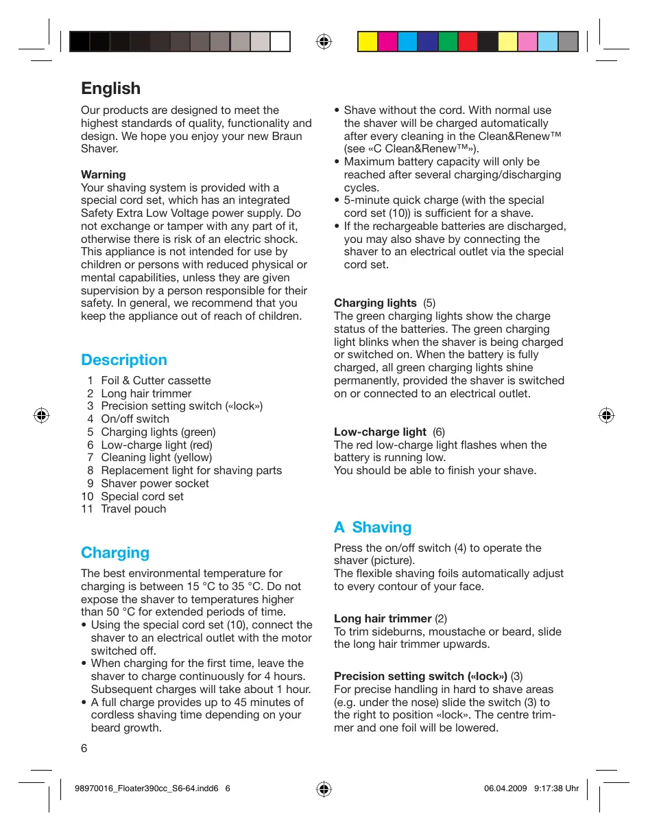 _| REC + Co Con | English Our products are designed to meet the highest standards of quality, functionality and design. We hope you enjoy your new Braun Shaver. Warning Your shaving system is provided with a special cord set, which has an integrated Safety Extra Low Voltage power supply. Do not exchange or tamper with any part of it, otherwise there is risk of an electric shock. This appliance is not intended for use by children or persons with reduced physical or mental capabilities, unless they are given supervision by a person responsible for their safety. In general, we recommend that you keep the appliance out of reach of children. Description Foil & Cutter cassette Long hair trimmer Precision setting switch («lock») Onvoff switch Charging lights (green) Low-charge light (red) Cleaning light (yellow) Replacement light for shaving parts Shaver power socket Special cord set Travel pouch 200H4ouRSwnN Charging The best environmental temperature for charging is between 15 °C to 85 °C. Do not expose the shaver to temperatures higher than 50 °C for extended periods of time. + Using the special cord set (10), connect the shaver to an electrical outlet with the motor switched off. + When charging for the first time, leave the shaver to charge continuously for 4 hours. Subsequent charges will take about 1 hour. + A full charge provides up to 45 minutes of cordiess shaving time depending on your beard growth.
