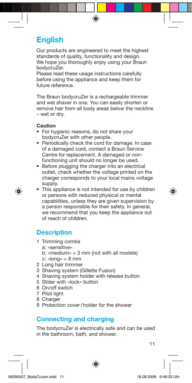 English Our products are engineered to meet the highest standards of quality, functionality and design. We hope you thoroughly enjoy using your Braun bodycruZer. Please read these usage instructions carefully before using the appliance and keep them for future reference. The Braun bodycruZer is a rechargeable trimmer and wet shaver in one. You can easily shorten or remove hair from all body areas below the neckline – wet or dry. Caution