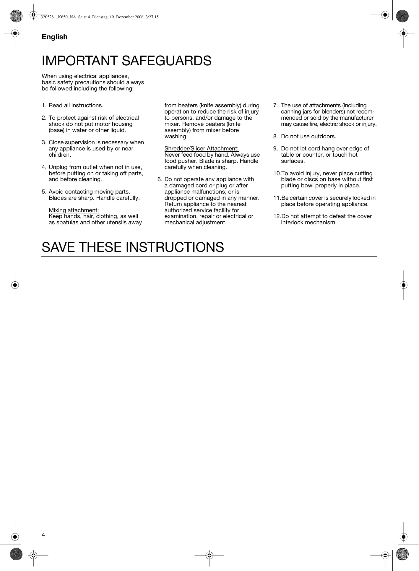 Blades are sharp. Handle carefully. Mixing attachi it: Keep hands, hair, clothing, as well as spatulas and other utensils away from beaters (knife assembly) during operation to reduce the risk of injury to persons, and/or damage to the mixer. Remove beaters (knife assembly) from mixer before washing. Shredder/Slicer Attachment: Never feed food by hand. Always use food pusher. Blade is sharp. Handle carefully when cleaning. . Do not operate any appliance with a damaged cord or plug or after appliance malfunctions, or is dropped or damaged in any manner. Return appliance to the nearest authorized service facility for examination, repair or electrical or mechanical adjustment.