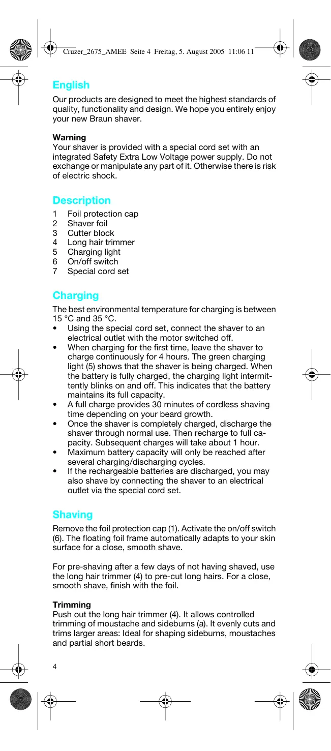 This guarantee does not cover: damage due to improper use, normal wear and tear (e.g. shaver foil or cutter block) as well as defects that have a negligible effect on the value or operation of the appliance. The guarantee becomes void if repairs are undertaken by unauthorised persons and if original Braun parts are not used.