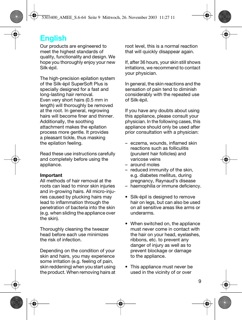 Änderungen vorbehalten. Dieses Gerät entspricht der EMV-Richtlinie 89/336/EWG, sowie der Niederspannungsrichtlinie 73/23/EWG. 5303400_AMEE_S.6-64 Seite 9 Mittwoch, 26. November 2003 11:27 11 English Our products are engineered to meet the highest standards of quality, functionality and design. We hope you thoroughly enjoy your new Silk·épil. The high-precision epilation system of the Silk·épil SuperSoft Plus is specially designed for a fast and long-lasting hair removal. Even very short hairs (0.5 mm in length) will thoroughly be removed at the root. In general, regrowing hairs will become finer and thinner. Additionally, the soothing attachment makes the epilation process more gentle. It provides a pleasant tickle, thus masking the epilation feeling. Read these use instructions carefully and completely before using the appliance. Important All methods of hair removal at the roots can lead to minor skin injuries and in-growing hairs. All micro-injuries caused by plucking hairs may lead to inflammation through the penetration of bacteria into the skin (e.g. when sliding the appliance over the skin). Thoroughly cleaning the tweezer head before each use minimizes the risk of infection. Depending on the condition of your skin and hairs, you may experience some irritation (e.g. feeling of pain, skin reddening) when you start using the product. When removing hairs at root level, this is a normal reaction that will quickly disappear again. If, after 36 hours, your skin still shows irritations, we recommend to contact your physician. In general, the skin reactions and the sensation of pain tend to diminish considerably with the repeated use of Silk·épil. If you have any doubts about using this appliance, please consult your physician. In the following cases, this appliance should only be used after prior consultation with a physician: – eczema, wounds, inflamed skin reactions such as folliculitis (purulent hair follicles) and varicose veins – around moles – reduced immunity of the skin, e.g. diabetes mellitus, during pregnancy, Raynaud’s disease – haemophilia or immune deficiency.