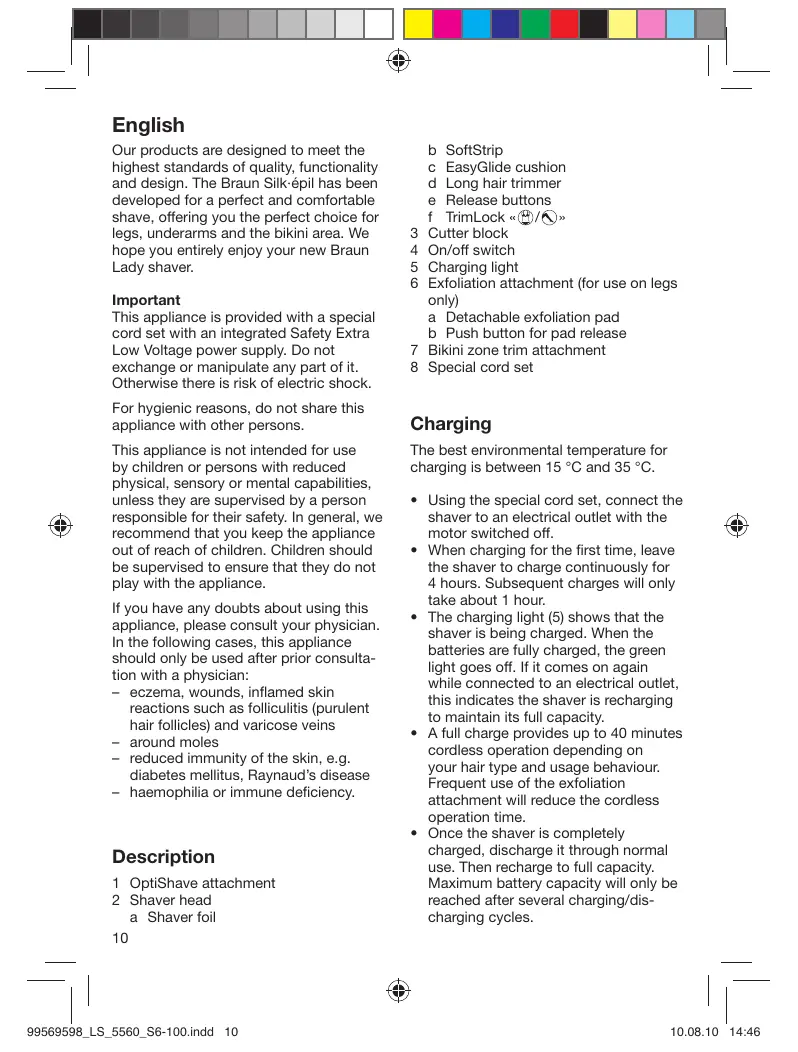 Once the shaver is completely charged, discharge it through normal use. Then recharge to full capacity. Maximum battery capacity will only be reached after several charging/dis- charging cycles.