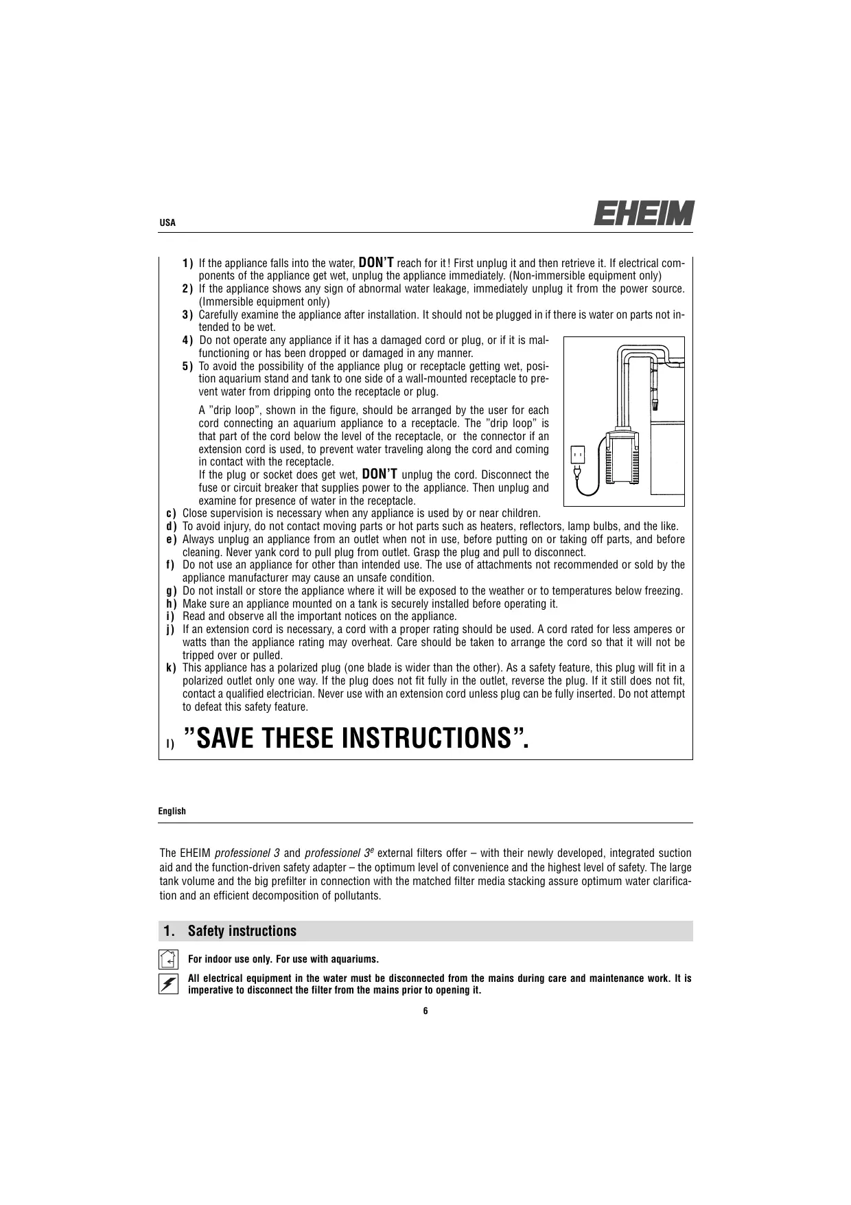 USA 1) If the appliance falls into the water, DON’T reach for it! First unplug it and then retrieve it. If electrical components of the appliance get wet, unplug the appliance immediately. (Non-immersible equipment only) 2 ) If the appliance shows any sign of abnormal water leakage, immediately unplug it from the power source. (Immersible equipment only) 3 ) Carefully examine the appliance after installation. It should not be plugged in if there is water on parts not intended to be wet. 4 ) Do not operate any appliance if it has a damaged cord or plug, or if it is malfunctioning or has been dropped or damaged in any manner. 5 ) To avoid the possibility of the appliance plug or receptacle getting wet, position aquarium stand and tank to one side of a wall-mounted receptacle to prevent water from dripping onto the receptacle or plug. A ”drip loop”, shown in the figure, should be arranged by the user for each cord connecting an aquarium appliance to a receptacle. The ”drip loop” is that part of the cord below the level of the receptacle, or the connector if an extension cord is used, to prevent water traveling along the cord and coming in contact with the receptacle. If the plug or socket does get wet, DON’T unplug the cord. Disconnect the fuse or circuit breaker that supplies power to the appliance. Then unplug and examine for presence of water in the receptacle. Close supervision is necessary when any appliance is used by or near children. To avoid injury, do not contact moving parts or hot parts such as heaters, reflectors, lamp bulbs, and the like. Always unplug an appliance from an outlet when not in use, before putting on or taking off parts, and before cleaning. Never yank cord to pull plug from outlet. Grasp the plug and pull to disconnect. Do not use an appliance for other than intended use. The use of attachments not recommended or sold by the appliance manufacturer may cause an unsafe condition. Do not install or store the appliance where it will be exposed to the weather or to temperatures below freezing. Make sure an appliance mounted on a tank is securely installed before operating it. Read and observe all the important notices on the appliance. If an extension cord is necessary, a cord with a proper rating should be used. A cord rated for less amperes or watts than the appliance rating may overheat. Care should be taken to arrange the cord so that it will not be tripped over or pulled. This appliance has a polarized plug (one blade is wider than the other). As a safety feature, this plug will fit in a polarized outlet only one way. If the plug does not fit fully in the outlet, reverse the plug. If it still does not fit, contact a qualified electrician. Never use with an extension cord unless plug can be fully inserted. Do not attempt to defeat this safety feature. The EHEIM professionel 3 and professionel 3 e external filters offer – with their newly developed, integrated suction aid and the function-driven safety adapter – the optimum level of convenience and the highest level of safety. The large tank volume and the big prefilter in connection with the matched filter media stacking assure optimum water clarification and an efficient decomposition of pollutants.