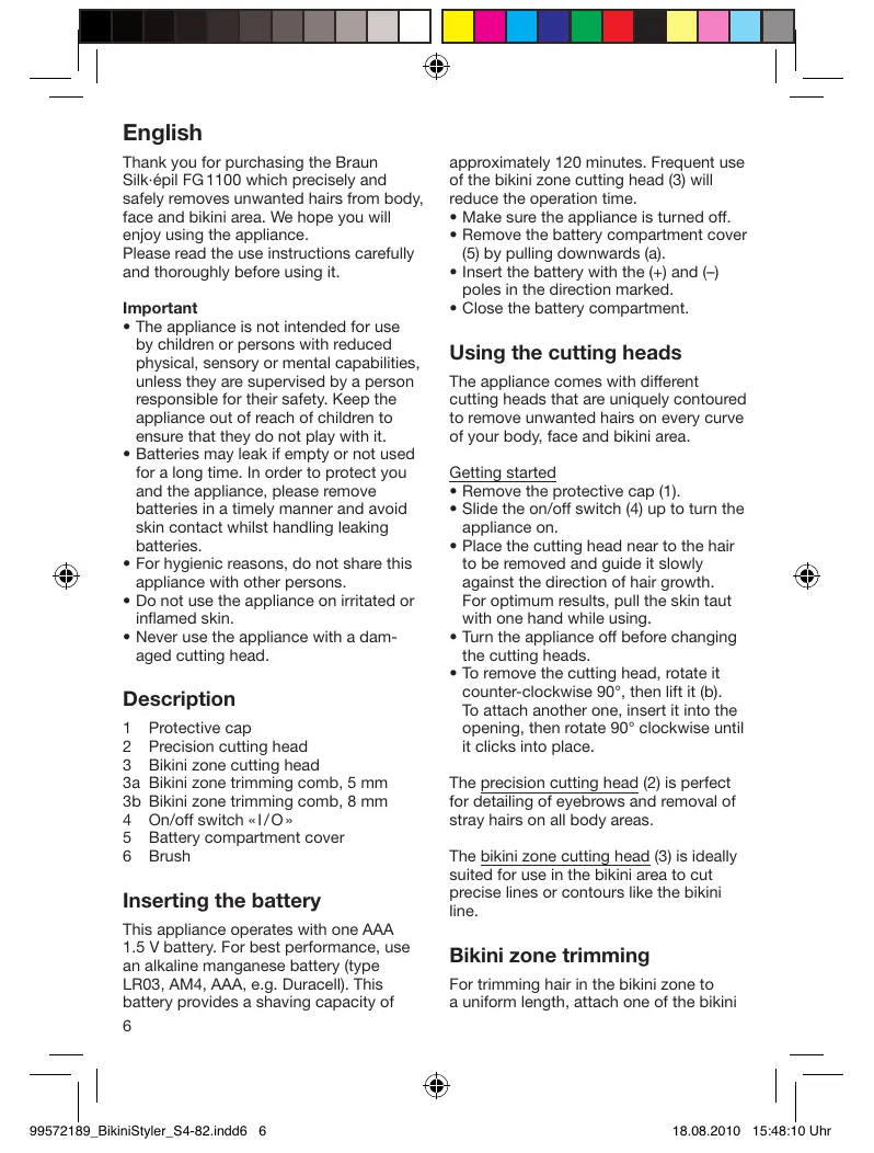 English Thank you for purchasing the Braun Silk-épil FG 1100 which precisely and safely removes unwanted hairs from body, face and bikini area. We hope you will enjoy using the appliance. Please read the use instructions carefully and thoroughly before using it Important + The appliance is not intended for use by children or persons with reduced physical, sensory or mental capabilities, unless they are supervised by a person responsible for their safety. Keep the appliance out of reach of children to ensure that they do not play with it. + Batteries may léak if empty or not used or a long time. In order to protect you and the appliance, please remove batteries in a timely manner and avoid skin contact whilst handling leaking batteries. + For hygienic reasons, do not share this appliance with other persons. + Do not use the appliance on irritated or inflamed skin. + Never use the appliance with a dam- aged cutting head. Description 1 Protective cap 2 Precision cutting head 3 Bikini zone cutting head 3a Bikini zone trimming comb, 5 mm 8b Bikini zone trimming comb, 8 mm 4 Onvoff switch «1/0» 5 Battery compartment cover 6 Brush Inserting the battery This appliance operates with one AAA