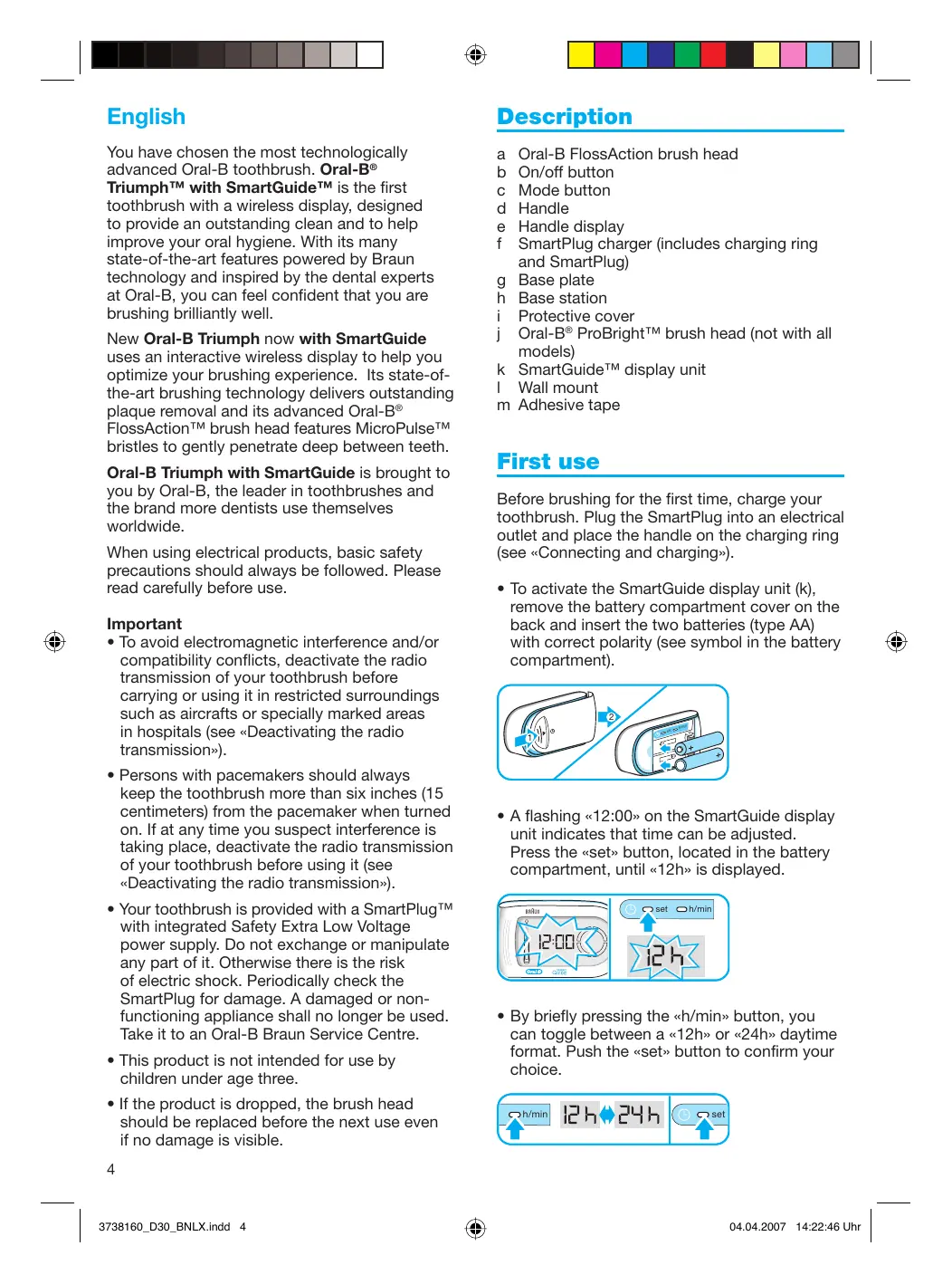 plaque removal and its advanced Oral-B° FlossAction’" brush head features MicroPulseT" bristles to gently penetrate deep between teeth. Oral-B Triumph with SmartGuide is brought to you by Oral-B, the leader in toothbrushes and the brand more dentists use themselves worldwide. When using electrical products, basic safety precautions should always be followed. Please read carefully before use. Important + To avoid electromagnetic interference and/or compatibility conticts, deactivate the radio transmission of your toothbrush before carrying or using it in restricted surroundings such as aircrafts or specially marked areas in hospitals (see «Deactivating the radio transmission»).
