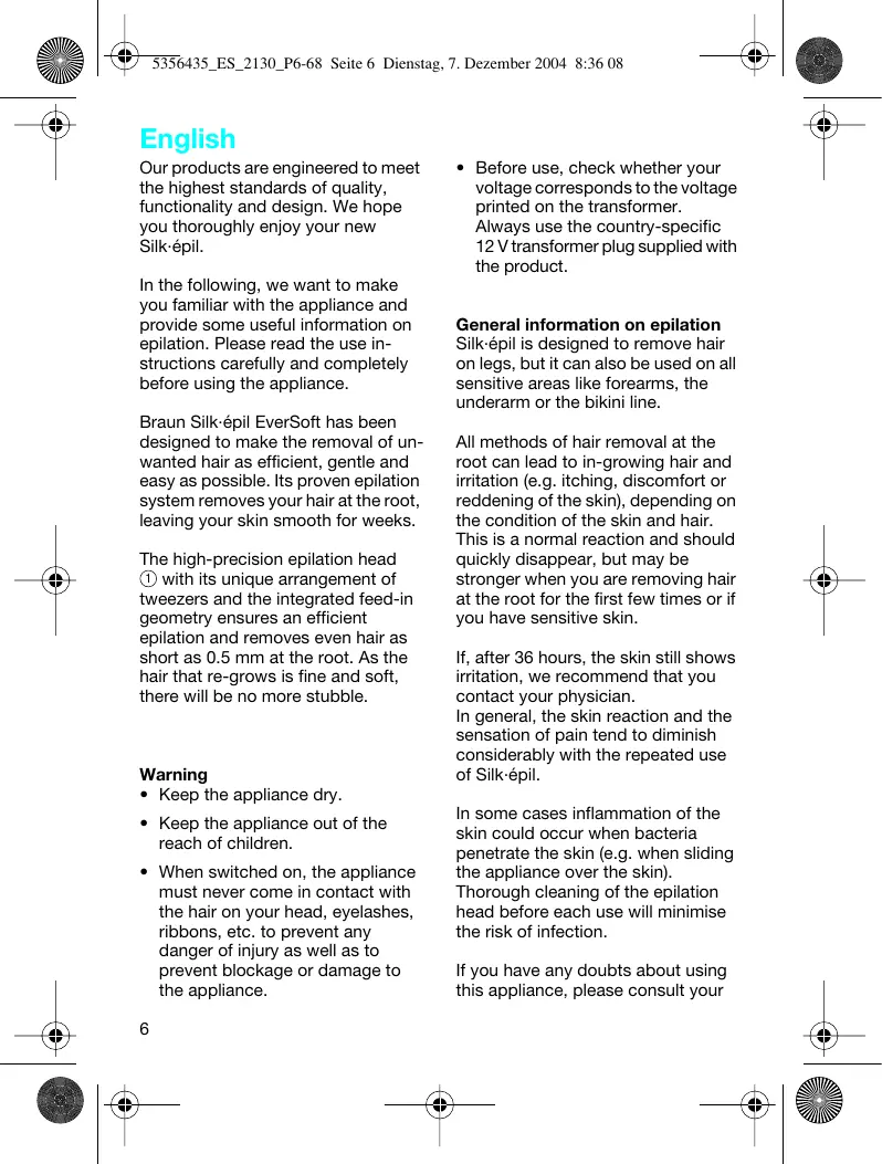 5356435_ES_2130_P6-68 Seite 6 Dienstag, 7. Dezember 2004 8:36 08 English Our products are engineered to meet the highest standards of quality, functionality and design. We hope you thoroughly enjoy your new Silk·épil. In the following, we want to make you familiar with the appliance and provide some useful information on epilation. Please read the use instructions carefully and completely before using the appliance. Braun Silk·épil EverSoft has been designed to make the removal of unwanted hair as efficient, gentle and easy as possible. Its proven epilation system removes your hair at the root, leaving your skin smooth for weeks. The high-precision epilation head 1 with its unique arrangement of tweezers and the integrated feed-in geometry ensures an efficient epilation and removes even hair as short as 0.5 mm at the root. As the hair that re-grows is fine and soft, there will be no more stubble. Warning