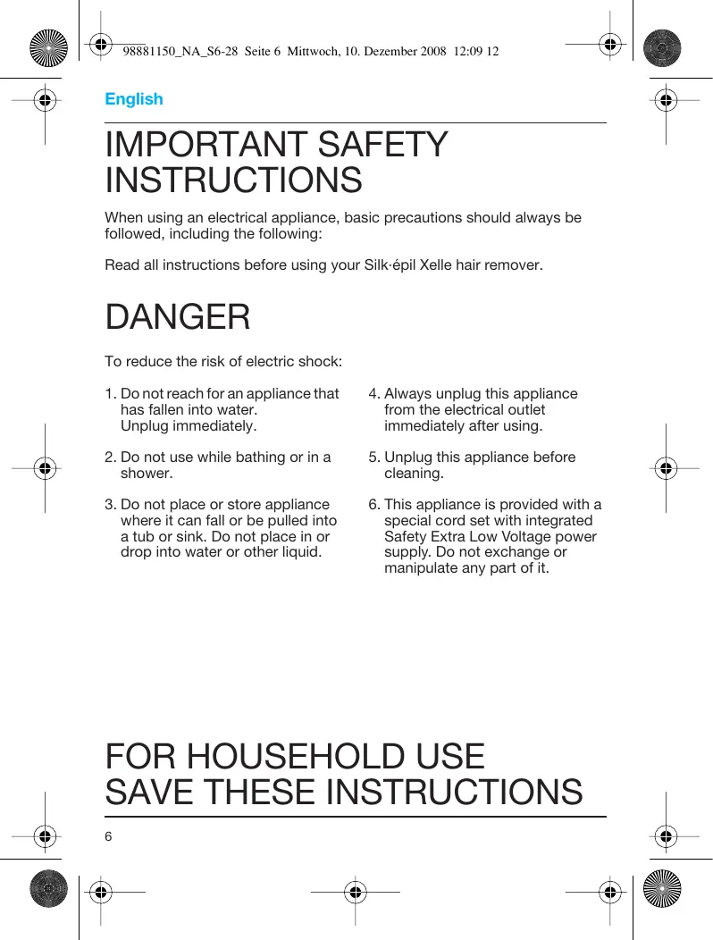 IMPORTANT SAFETY INSTRUCTIONS When using an electrical appliance, basic precautions should always be followed, including the following: Read all instructions before using your Silk·épil Xelle hair remover. DANGER To reduce the risk of electric shock: