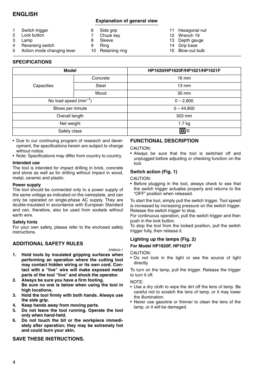 - Before plugging in the tool, always check to see that the switch trigger actuates properly and returns to the “OFF” position when released. To start the tool, simply pull the switch trigger. Tool speed is increased by increasing pressure on the switch trigger. Release the switch trigger to stop. For continuous operation, pull the switch trigger and then push in the lock button. To stop the tool from the locked position, pull the switch trigger fully, then release it. Lighting up the lamps (Fig. 2) For Model HP1620F, HP1621F ENB002-1
