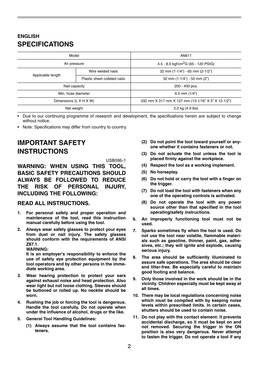18. Use only nails specified in this manual. The use of any other nails may cause malfunction of the tool.