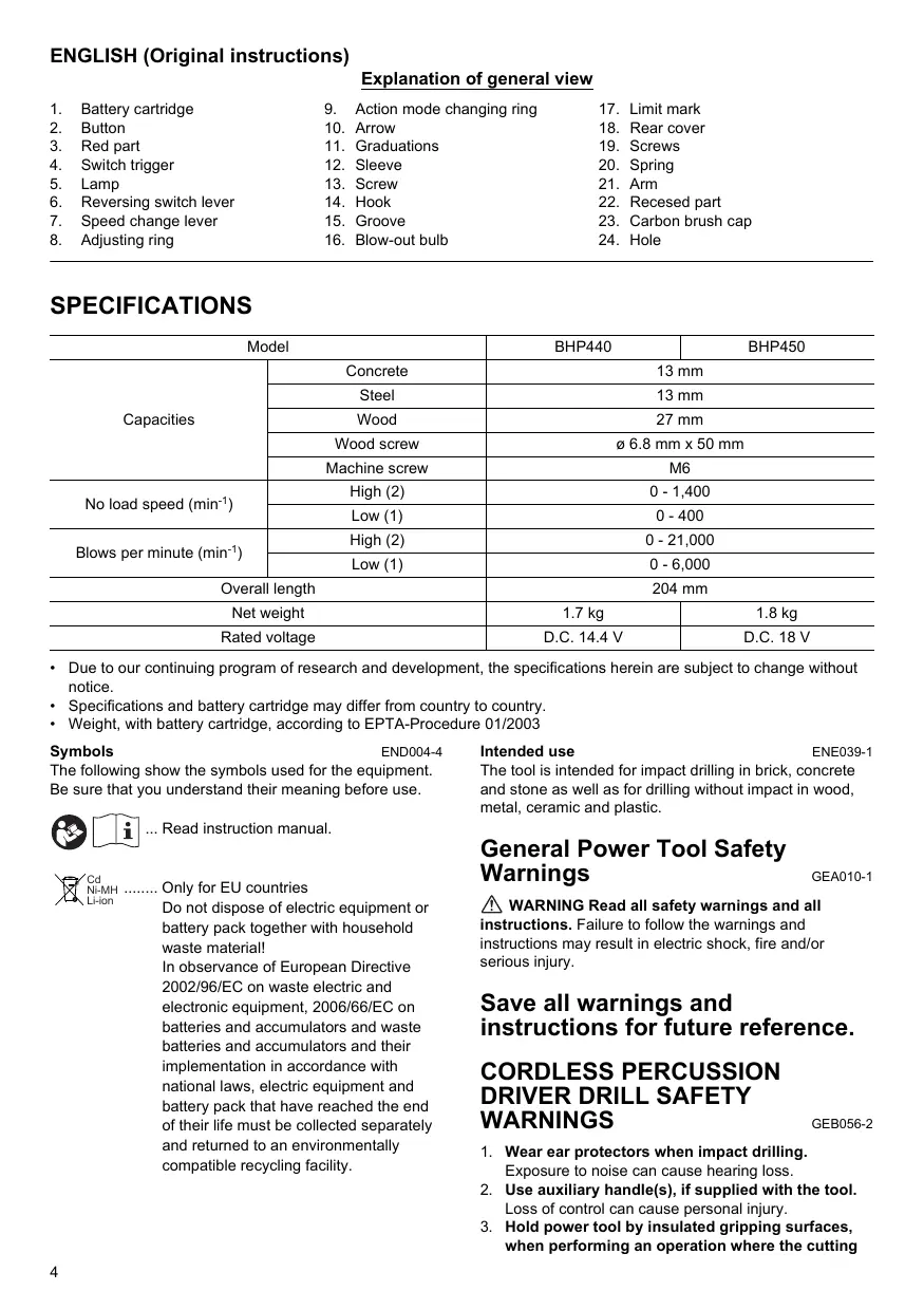 SPECIFICATIONS Model BHP440 BHP450 Concrete 13 mm Steel 13 mm Capacities Wood 27 mm Wood screw 6 6.8 mm x 50 mm Machine screw M6 High (2) 0-1,400 No load speed (min!) Low (1) 0-400 High (2) 0-21,000 Blows per minute (min) Low (1) 0-6,000 Overall length 204 mm Net weight 17kg 1.8kg Rated voltage D.C.144V DC.18V + Due to our continuing program of research and development, the specifications herein are subject to change without notice. + Specifications and battery cartridge may differ from country to country. + Weight, with battery cartridge, according to EPTA-Procedure 01/2003 Symbols ENDO044 intended use ENE039-1 The following show the symbols used for the equipment. Be sure that you understand their meaning before use. @ [TA] Read instruction manual. Only for EU countries Do not dispose of electric equipment or battery pack together with household waste material! In observance of European Directive 2002/96/EC on waste electric and electronic equipment, 2006/66/EC on batteries and accumulators and waste batteries and accumulators and their implementation in accordance with national laws, electric equipment and battery pack that have reached the end of their life must be collected separately and returned to an environmentally compatible recycling facility. The tool is intended for impact drilling in brick, concrete and stone as well as for drilling without impact in wood, metal, ceramic and plastic. General Power Tool Safety Warnings À\ WARNING Read all safety warnings and all instructions. Failure to follow the warnings and instructions may result in electric shock, fire and/or serious injury. GEA010-1 Save all warnings and instructions for future reference. CORDLESS PERCUSSION