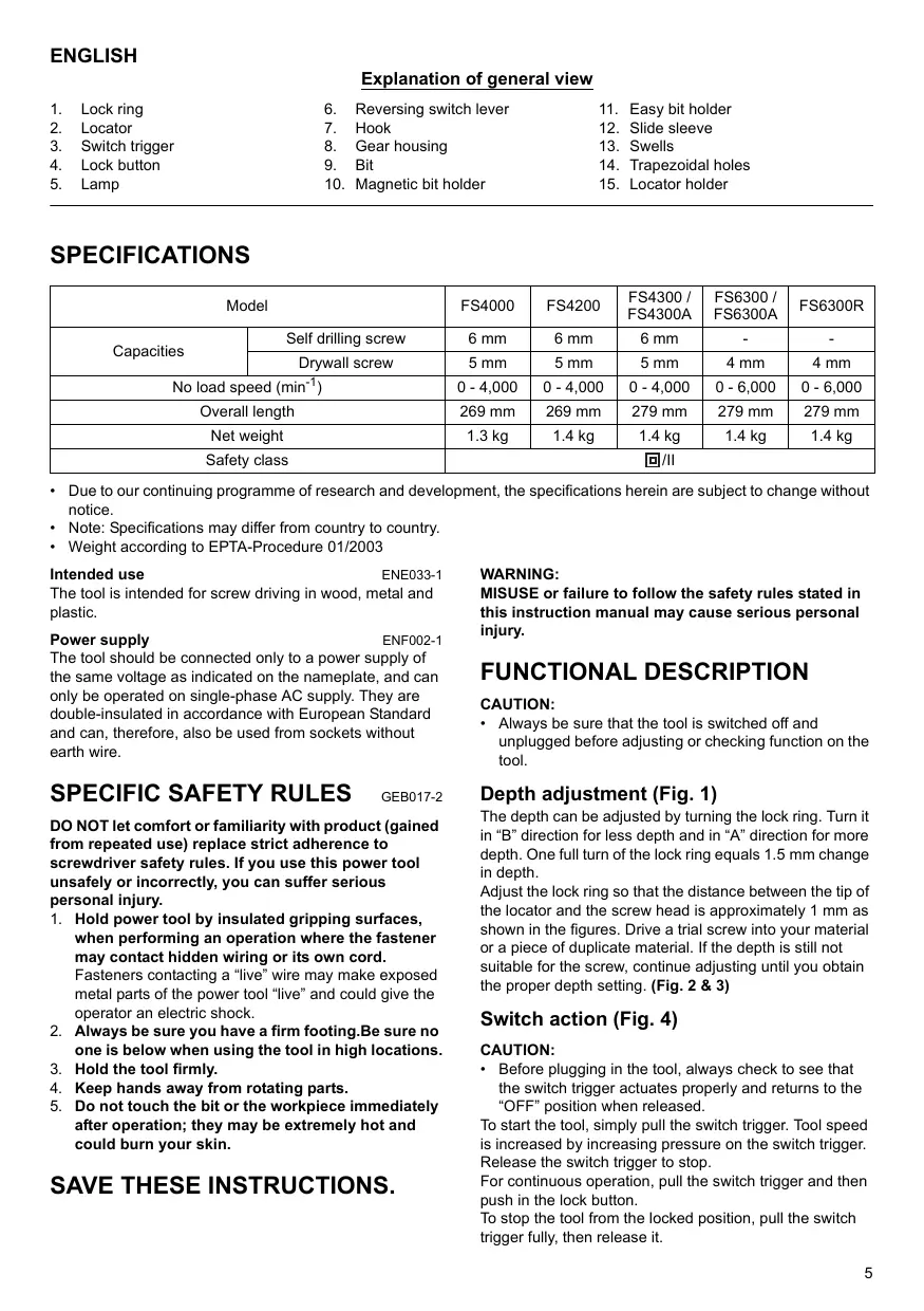 SPECIFICATIONS FS4300 / | FS6300/ Model FS4000 | FS4200 | Soon | FS63004 | FS6300R Self driling screw 6 mm 6 mm 6 mm - = Capacities Drywall screw 5mm 5mm 5mm 4 mm 4 mm No load speed (min?) 0-4,000 | 0-4,000 | 0-4,000 | 0-6,000 | 0-6,000 Overall length 269 mm | 269 mm | 279mm | 279mm | 279mm Net weight 13kg 14kg 14kg 14kg 14kg Safety class Œ/ notice. Note: Specifications may differ from country to country. Weight according to EPTA-Procedure 01/2003 Intended use ENE033-1 The tool is intended for screw driving in wood, metal and plastic. Power supply ENFO02-1 The tool should be connected only to a power supply of the same voltage as indicated on the nameplate, and can only be operated on single-phase AC supply. They are double-insulated in accordance with European Standard and can, therefore, also be used from sockets without earth wire.