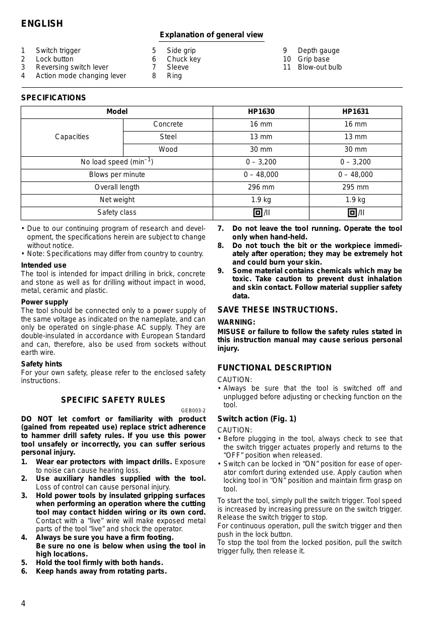 ENGLISH Explanation of general view 1 Switch tigger 5 Side grip 9 Depth gauge 2 Lock button 6 Chuckkey 10 Grip base 3 Reversing switch lever 7 Sleeve 11 Blow-outbulb 4 Action mode changing lever 8 Ring SPECIFICATIONS Model HP1630 HP1631 Concrete 16 mm 16 mm Capacities Steel 13 mm 13mm Wood 30 mm 30 mm No load speed (min +) 0- 3,200 0- 3,200 Blows per minute 0- 48,000 0- 48,000 Overall length 296 mm 295 mm Net weight L9Kkg L9Kkg Safety class E/ [EI + Due to our continuing program of research and devel- opment, the specifications herein are subjectto change without notice. + Note: Specifications may differ from country to country. Intended use The tool is intended for impact driling in brick, concrete and stone as well as for drillng without impact in wood, metal, ceramic and plastic. Power supply The tool should be connected only to a power supply of the same voltage as indicated on the nameplate, and can only be operated on single-phase AC supply. They are double-insulated in accordance with European Standard and can, therefore, also be used from sockets without earth wire. Safety hints For your own safety, please refer to the enclosed safety instructions.