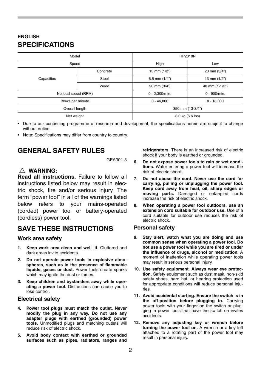 HP2010N - Hammer drill MAKITA - Free user manual and instructions