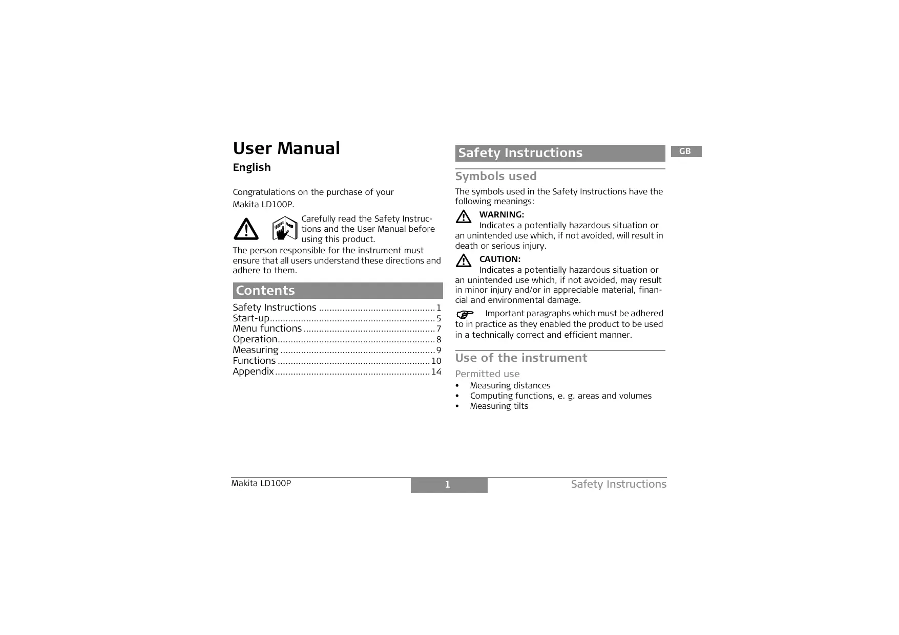 Download the instructions for your Measuring tool in PDF format for free! Find your manual LD100P - MAKITA and take your electronic device back in hand. On this page are published all the documents necessary for the use of your device. LD100P by MAKITA.