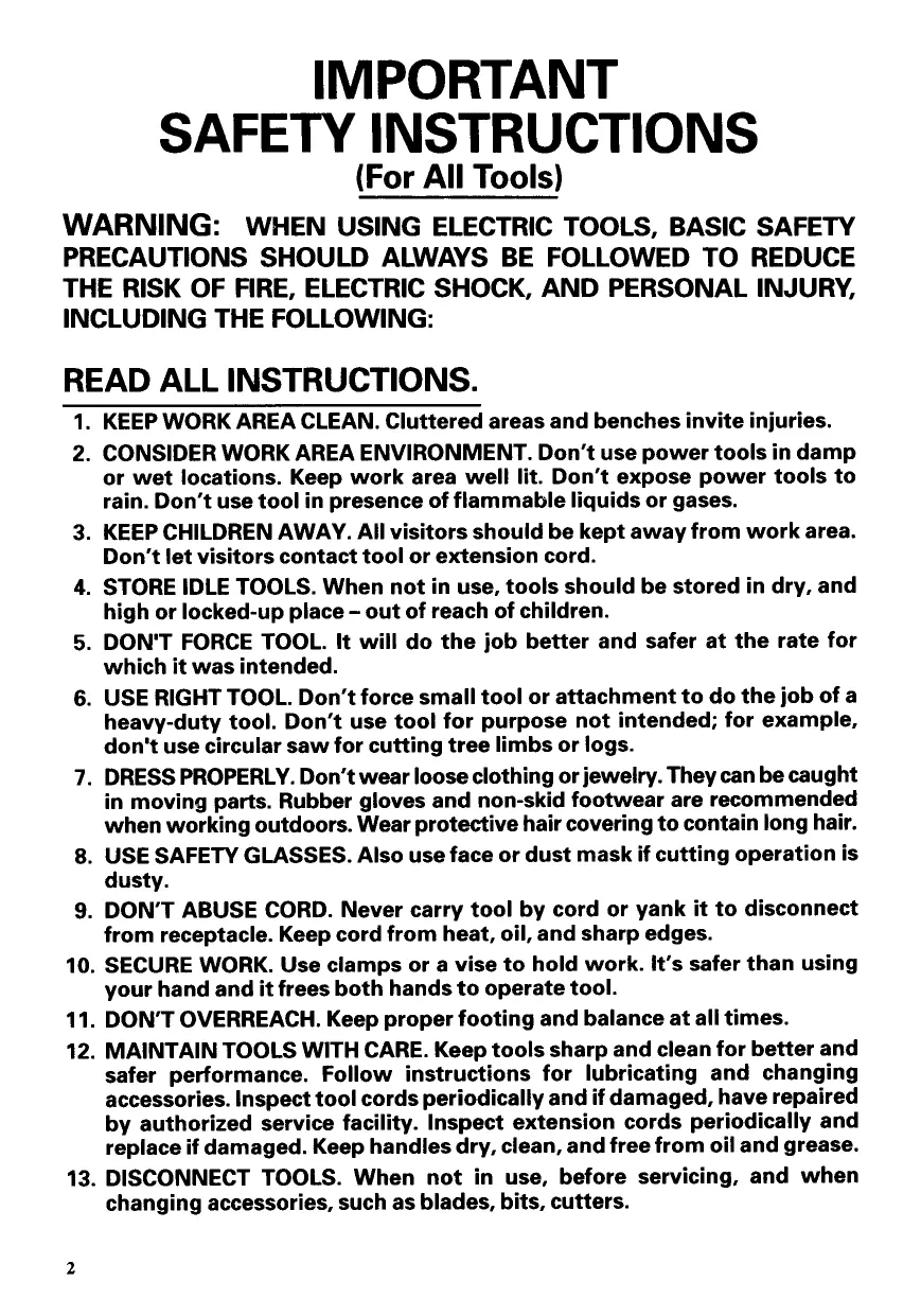 KEEP WORK AREA CLEAN. Cluttered areas and benches invite injuries. CONSIDER WORK AREA ENVIRONMENT. Don‘t use power tools in damp or wet locations. Keep work area well lit. Don't expose power tools to rain. Don‘t use tool in presence of flammable liquids or gases. . KEEP CHILDREN AWAY. All visitors should be kept away from work area. Don't let visitors contact tool or extension cord. . STORE IDLE TOOLS. When not in use, tools should be stored in dry, and high or locked-up place - out of reach of children. . DON'T FORCE TOOL. It will do the job better and safer at the rate for which it was intended. . USE RIGHT TOOL. Don't force small tool or attachment to do the job of a heavy-duty tool. Don't use tool for purpose not intended; for example, don't use circular saw for cutting tree limbs or logs. . DRESS PROPERLY. Don't wear loose clothing or jewelry. They can be caught in moving parts. Rubber gloves and non-skid footwear are recommended when working outdoors. Wear protective hair covering to contain long hair. . USE SAFETY GLASSES. Also use face or dust mask if cutting operation is dusty. . DON'T ABUSE CORD. Never carry tool by cord or yank it to disconnect from receptacle. Keep cord from heat, oil, and sharp edges. , SECURE WORK. Use clamps or a vise to hold work. It's safer than using your hand and it frees both hands to operate tool. . DON'T OVERREACH. Keep proper footing and balance at all times. . MAINTAIN TOOLS WITH CARE. Keep tools sharp and clean for better and safer performance. Follow instructions for lubricating and changing accessories. Inspect tool cords periodically and if damaged, have repaired by authorized service facility. Inspect extension cords periodically and replace if damaged. Keep handles dry, clean, and free from oil and grease. DISCONNECT TOOLS. When not in use, before servicing, and when changing accessories, such as blades, bits, cutters.