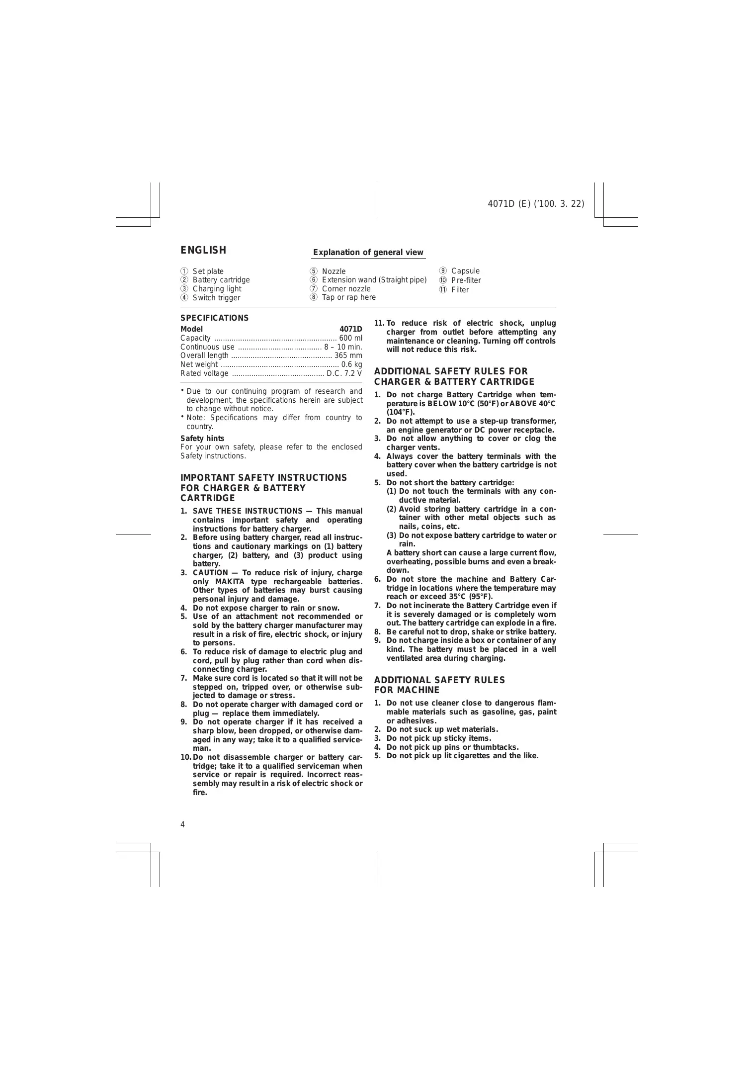 4071D Capacity 600 ml Continuous use 8 – 10 min. Overall length 365 mm Net weight 0.6 kg Rated voltage D.C. 7.2 V • Due to our continuing program of research and development, the specifications herein are subject to change without notice. • Note: Specifications may differ from country to country. Safety hints For your own safety, please refer to the enclosed Safety instructions.