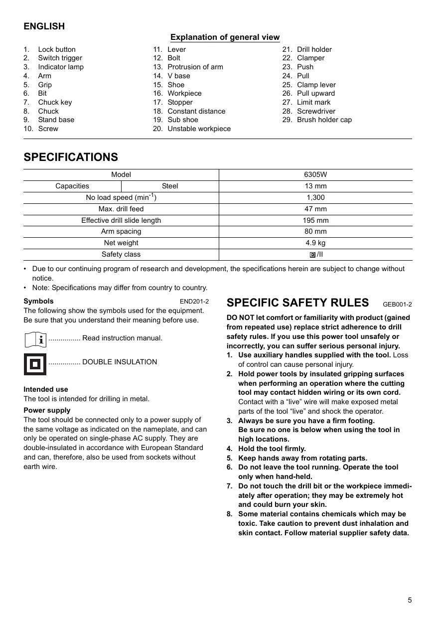 - Note: Specifications may differ from country to country. END201-2 Symbols The following show the symbols used for the equipment. Be sure that you understand their meaning before use. ................ Read instruction manual. ................ DOUBLE INSULATION Intended use The tool is intended for drilling in metal. Power supply The tool should be connected only to a power supply of the same voltage as indicated on the nameplate, and can only be operated on single-phase AC supply. They are double-insulated in accordance with European Standard and can, therefore, also be used from sockets without earth wire.