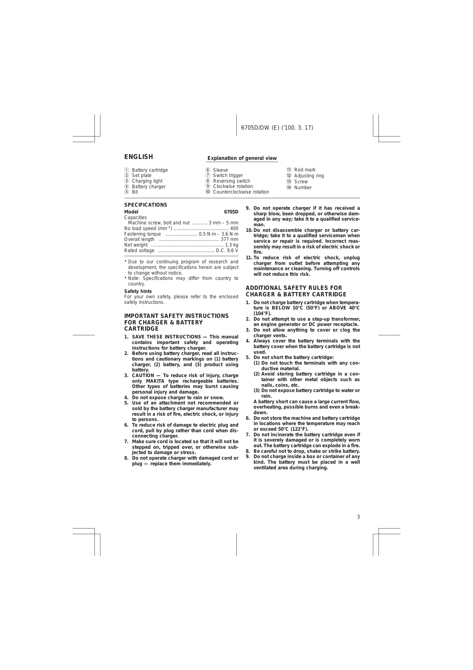 6705D Capacities Machine screw, bolt and nut 3 mm – 5 mm No load speed (min-1) 400 Fastening torque 0.5 N.m – 3.6 N.m Overall length 377 mm Net weight 1.3 kg Rated voltage D.C. 9.6 V • Due to our continuing program of research and development, the specifications herein are subject to change without notice. • Note: Specifications may differ from country to country. Safety hints For your own safety, please refer to the enclosed safety instructions.