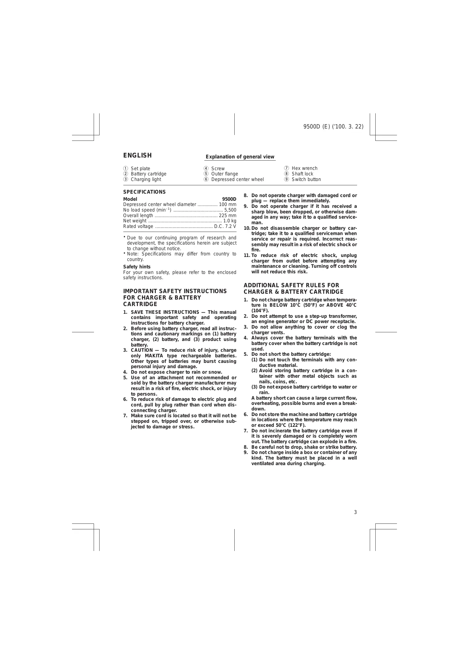SPECIFICATIONS Model 9500D Depressed center wheel diameter 100 mm –1 No load speed (min ) 5,500 Overall length 225 mm Net weight 1.0 kg Rated voltage D.C. 7.2 V • Due to our continuing program of research and development, the specifications herein are subject to change without notice. • Note: Specifications may differ from country to country. Safety hints For your own safety, please refer to the enclosed safety instructions.