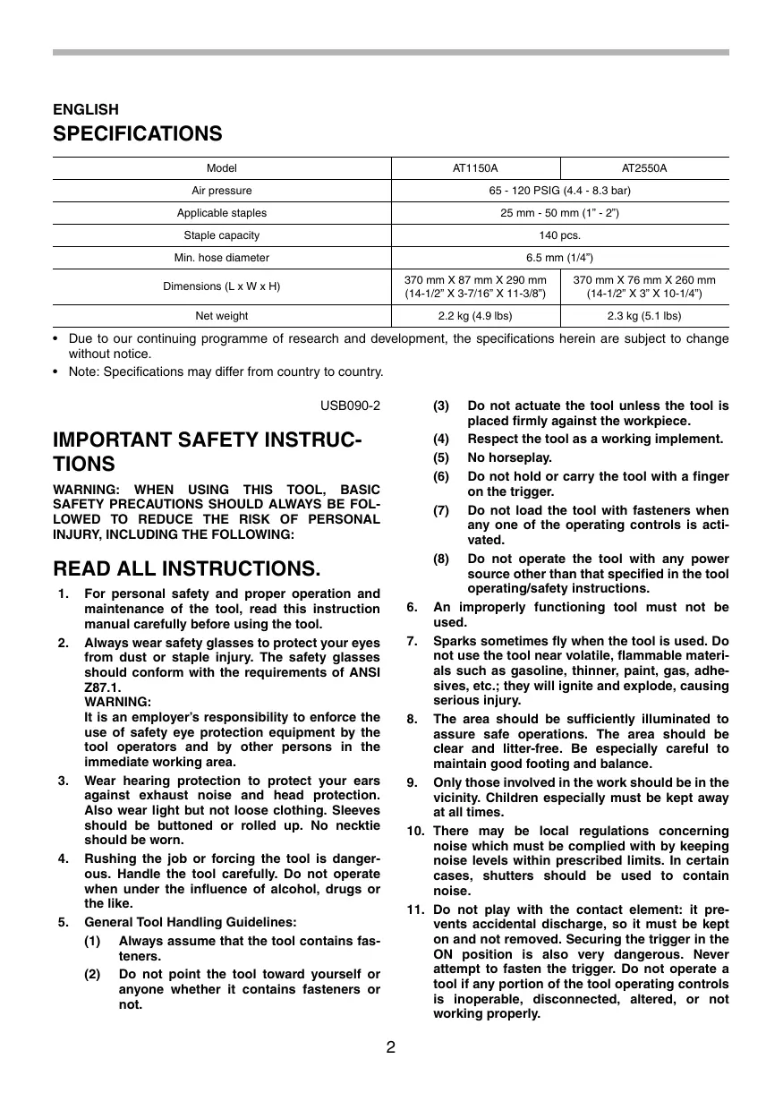 - Note: Specifications may differ from country to country. USB090-2 (3) Do not actuate the tool unless the tool is placed firmly against the workpiece. (4) Respect the tool as a working implement. (5) No horseplay. (6) Do not hold or carry the tool with a finger on the trigger. (7) Do not load the tool with fasteners when any one of the operating controls is activated. (8) Do not operate the tool with any power source other than that specified in the tool operating/safety instructions.