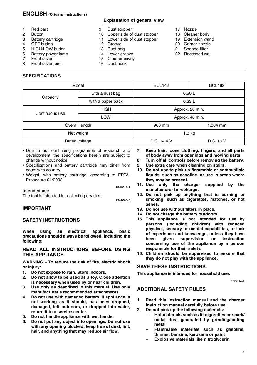 D.C. 18 V Keep hair, loose clothing, fingers, and all parts of body away from openings and moving parts. Turn off all controls before removing the battery. Use extra care when cleaning on stairs. Do not use to pick up flammable or combustible liquids, such as gasoline, or use in areas where they may be present. Use only the charger supplied by the manufacturer to recharge. Do not pick up anything that is burning or smoking, such as cigarettes, matches, or hot ashes. Do not use without filters in place. Do not charge the battery outdoors. This appliance is not intended for use by persons (including children) with reduced physical, sensory or mental capabilities, or lack of experience and knowledge, unless they have been given supervision instruction concerning use of the appliance by a person responsible for their safety. Children should be supervised to ensure that they do not play with the appliance. SAVE THESE INSTRUCTIONS. This appliance is intended for household use. ENB114-2