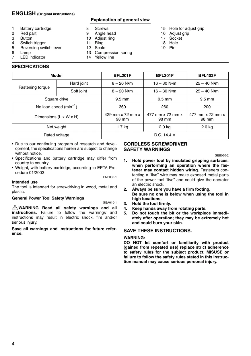 ENG905-1 Noise The typical A-weighted noise level determined according to EN60745: Model BFL201F, BFL402F Sound pressure level (LpA): 72 dB (A) Uncertainty (K): 3 dB (A) The noise level under working may exceed 80 dB (A). Model BFL301F Sound pressure level (LpA): 74 dB (A) Uncertainty (K): 3 dB (A) The noise level under working may exceed 80 dB (A). Wear ear protection ENG900-1 Vibration The vibration total value (tri-axial vector sum) determined according to EN60745: Work mode: screwdriving without impact Vibration emission (ah): 2.5 m/s2 or less Uncertainty (K): 1.5 m/s2 ENG901-1