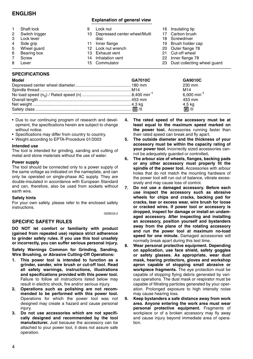 SPECIFICATIONS Model GA7010C Depressed center wheel diameter 180 mm Spindle thread M14 No load speed (n0) / Rated speed (n) 8,400 min-1 Overall length 453 mm Net weight 4.3 kg Safety class /II • Due to our continuing program of research and development, the specifications herein are subject to change without notice. • Specifications may differ from country to country. • Weight according to EPTA-Procedure 01/2003 Intended use The tool is intended for grinding, sanding and cutting of metal and stone materials without the use of water. Power supply The tool should be connected only to a power supply of the same voltage as indicated on the nameplate, and can only be operated on single-phase AC supply. They are double-insulated in accordance with European Standard and can, therefore, also be used from sockets without earth wire.