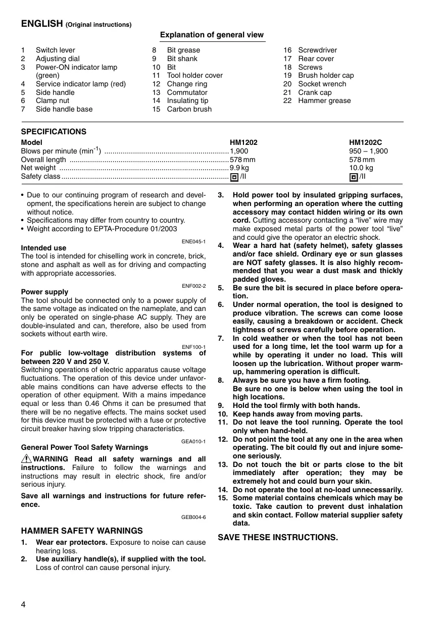 HM1202 Blows per minute (min-1) 1,900 Overall length 578 mm Net weight 9.9 kg Safety class /II • Due to our continuing program of research and development, the specifications herein are subject to change without notice. • Specifications may differ from country to country. • Weight according to EPTA-Procedure 01/2003 ENE045-1