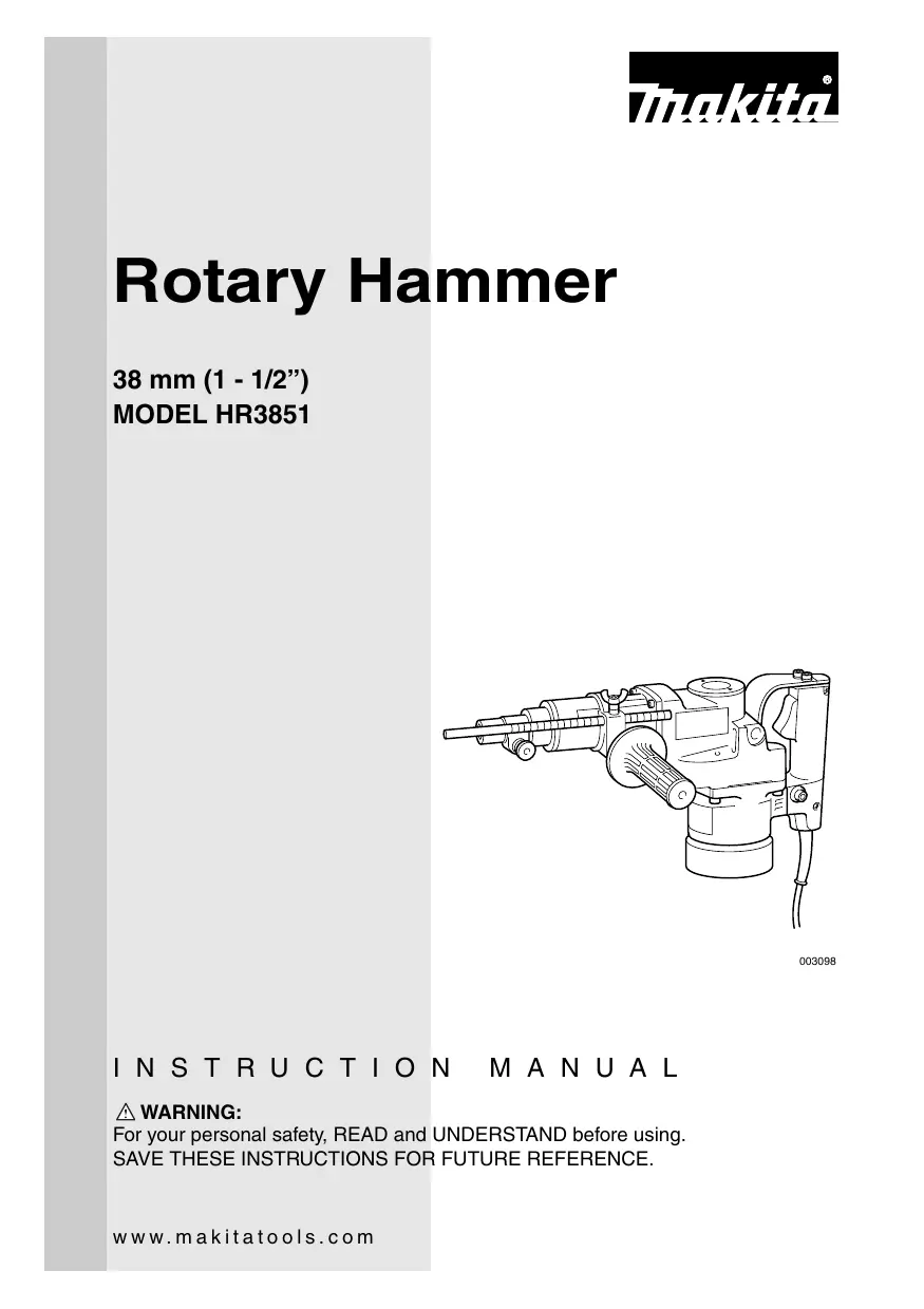 Download the instructions for your Jackhammer in PDF format for free! Find your manual HR3851 - MAKITA and take your electronic device back in hand. On this page are published all the documents necessary for the use of your device. HR3851 by MAKITA.
