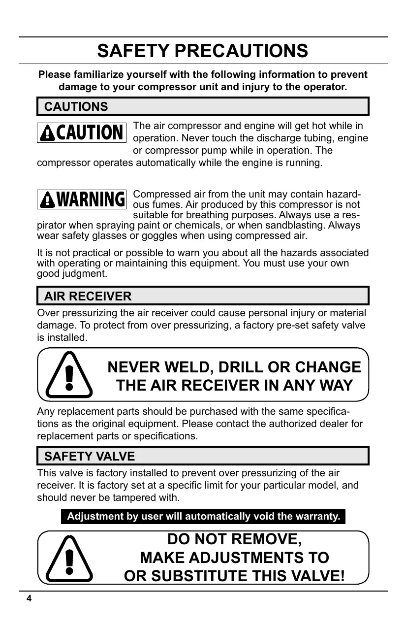 SAFETY PRECAUTIONS Please familiarize yourself with the following information to prevent damage to your compressor unit and injury to the operator. CAUTIONS The air compressor and engine will get hot while in operation. Never touch the discharge tubing, engine or compressor pump while in operation. The compressor operates automatically while the engine is running. CAUTION Compressed air from the unit may contain hazardous fumes. Air produced by this compressor is not suitable for breathing purposes. Always use a respirator when spraying paint or chemicals, or when sandblasting. Always wear safety glasses or goggles when using compressed air. WARNING It is not practical or possible to warn you about all the hazards associated with operating or maintaining this equipment. You must use your own good judgment. AIR RECEIVER Over pressurizing the air receiver could cause personal injury or material damage. To protect from over pressurizing, a factory pre-set safety valve is installed.