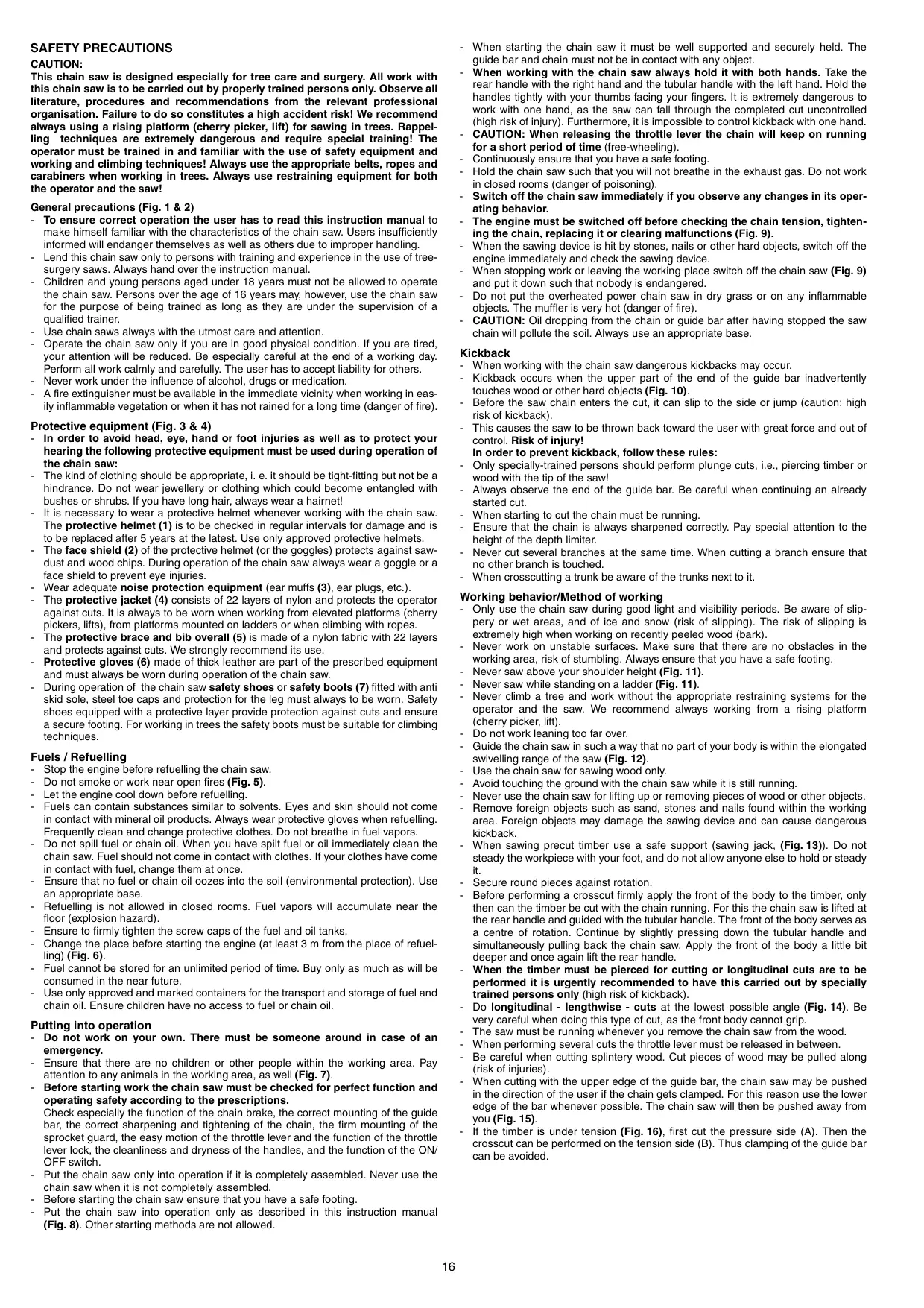 - When starting the chain saw it must be well supported and securely held. The guide bar and chain must not be in contact with any object. - When working with the chain saw always hold it with both hands. Take the rear handle with the right hand and the tubular handle with the left hand. Hold the handles tightly with your thumbs facing your fingers. It is extremely dangerous to work with one hand, as the saw can fall through the completed cut uncontrolled (high risk of injury). Furthermore, it is impossible to control kickback with one hand. - CAUTION: When releasing the throttle lever the chain will keep on running for a short period of time (free-wheeling). - Continuously ensure that you have a safe footing. - Hold the chain saw such that you will not breathe in the exhaust gas. Do not work in closed rooms (danger of poisoning). - Switch off the chain saw immediately if you observe any changes in its operating behavior. - The engine must be switched off before checking the chain tension, tightening the chain, replacing it or clearing malfunctions (Fig. 9). - When the sawing device is hit by stones, nails or other hard objects, switch off the engine immediately and check the sawing device. - When stopping work or leaving the working place switch off the chain saw (Fig. 9) and put it down such that nobody is endangered. - Do not put the overheated power chain saw in dry grass or on any inflammable objects. The muffler is very hot (danger of fire). - CAUTION: Oil dropping from the chain or guide bar after having stopped the saw chain will pollute the soil. Always use an appropriate base. SAFETY PRECAUTIONS CAUTION: This chain saw is designed especially for tree care and surgery. All work with this chain saw is to be carried out by properly trained persons only. Observe all literature, procedures and recommendations from the relevant professional organisation. Failure to do so constitutes a high accident risk! We recommend always using a rising platform (cherry picker, lift) for sawing in trees. Rappelling techniques are extremely dangerous and require special training! The operator must be trained in and familiar with the use of safety equipment and working and climbing techniques! Always use the appropriate belts, ropes and carabiners when working in trees. Always use restraining equipment for both the operator and the saw! General precautions (Fig. 1 & 2) - To ensure correct operation the user has to read this instruction manual to make himself familiar with the characteristics of the chain saw. Users insufficiently informed will endanger themselves as well as others due to improper handling. - Lend this chain saw only to persons with training and experience in the use of treesurgery saws. Always hand over the instruction manual. - Children and young persons aged under 18 years must not be allowed to operate the chain saw. Persons over the age of 16 years may, however, use the chain saw for the purpose of being trained as long as they are under the supervision of a qualified trainer. - Use chain saws always with the utmost care and attention. - Operate the chain saw only if you are in good physical condition. If you are tired, your attention will be reduced. Be especially careful at the end of a working day. Perform all work calmly and carefully. The user has to accept liability for others. - Never work under the influence of alcohol, drugs or medication. - A fire extinguisher must be available in the immediate vicinity when working in easily inflammable vegetation or when it has not rained for a long time (danger of fire). Kickback - When working with the chain saw dangerous kickbacks may occur. - Kickback occurs when the upper part of the end of the guide bar inadvertently touches wood or other hard objects (Fig. 10). - Before the saw chain enters the cut, it can slip to the side or jump (caution: high risk of kickback). - This causes the saw to be thrown back toward the user with great force and out of control. Risk of injury! In order to prevent kickback, follow these rules: - Only specially-trained persons should perform plunge cuts, i.e., piercing timber or wood with the tip of the saw! - Always observe the end of the guide bar. Be careful when continuing an already started cut. - When starting to cut the chain must be running. - Ensure that the chain is always sharpened correctly. Pay special attention to the height of the depth limiter. - Never cut several branches at the same time. When cutting a branch ensure that no other branch is touched. - When crosscutting a trunk be aware of the trunks next to it. Protective equipment (Fig. 3 & 4) - In order to avoid head, eye, hand or foot injuries as well as to protect your hearing the following protective equipment must be used during operation of the chain saw: - The kind of clothing should be appropriate, i. e. it should be tight-fitting but not be a hindrance. Do not wear jewellery or clothing which could become entangled with bushes or shrubs. If you have long hair, always wear a hairnet! - It is necessary to wear a protective helmet whenever working with the chain saw. The protective helmet (1) is to be checked in regular intervals for damage and is to be replaced after 5 years at the latest. Use only approved protective helmets. - The face shield (2) of the protective helmet (or the goggles) protects against sawdust and wood chips. During operation of the chain saw always wear a goggle or a face shield to prevent eye injuries. - Wear adequate noise protection equipment (ear muffs (3), ear plugs, etc.). - The protective jacket (4) consists of 22 layers of nylon and protects the operator against cuts. It is always to be worn when working from elevated platforms (cherry pickers, lifts), from platforms mounted on ladders or when climbing with ropes. - The protective brace and bib overall (5) is made of a nylon fabric with 22 layers and protects against cuts. We strongly recommend its use. - Protective gloves (6) made of thick leathe