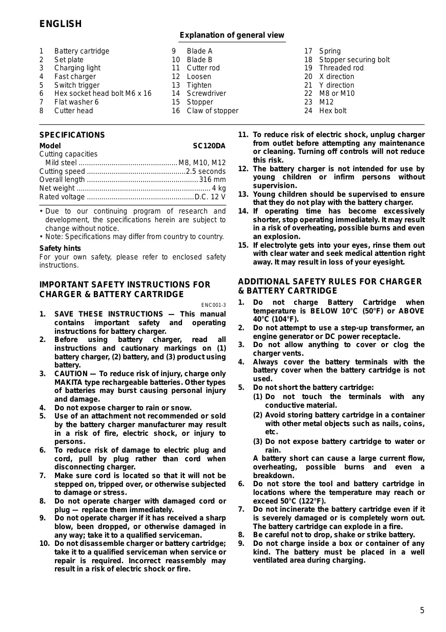 & BATTERY CARTRIDGE SPECIFICATIONS Model SC120DA Cutting capacities Mild steel ................................................ M8, M10, M12 Cutting speed ................................................2.5 seconds Overall length ...................................................... 316 mm Net weight ................................................................. 4 kg Rated voltage ....................................................D.C. 12 V