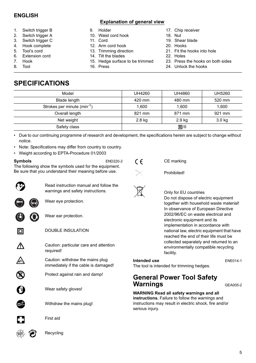- Weight according to EPTA-Procedure 01/2003 END220-2 Symbols The following show the symbols used for the equipment. Be sure that you understand their meaning before use. Read instruction manual and follow the warnings and safety instructions. Wear eye protection. Wear ear protection. DOUBLE INSULATION Caution: particular care and attention required! CE marking Prohibited! Only for EU countries Do not dispose of electric equipment together with household waste material! In observance of European Directive 2002/96/EC on waste electrical and electronic equipment and its implementation in accordance with national law, electric equipment that have reached the end of their life must be collected separately and returned to an environmentally compatible recycling facility. Caution: withdraw the mains plug immediately if the cable is damaged! Intended use The tool is intended for trimming hedges. Protect against rain and damp! General Power Tool Safety Warnings Wear safety gloves! Withdraw the mains plug! ENE014-1 GEA005-2 WARNING Read all safety warnings and all instructions. Failure to follow the warnings and instructions may result in electric shock, fire and/or serious injury. First aid Recycling