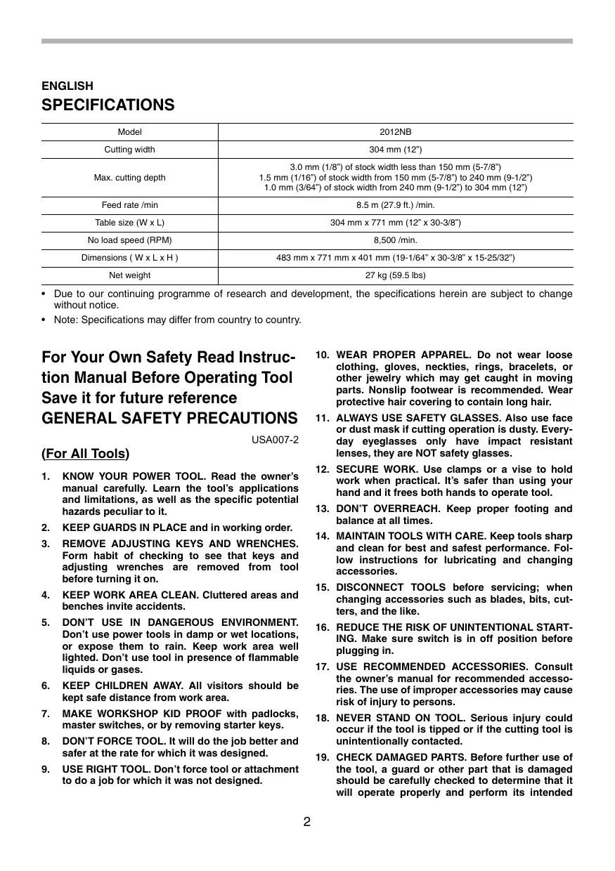 - Note: Specifications may differ from country to country. For Your Own Safety Read Instruction Manual Before Operating Tool Save it for future reference