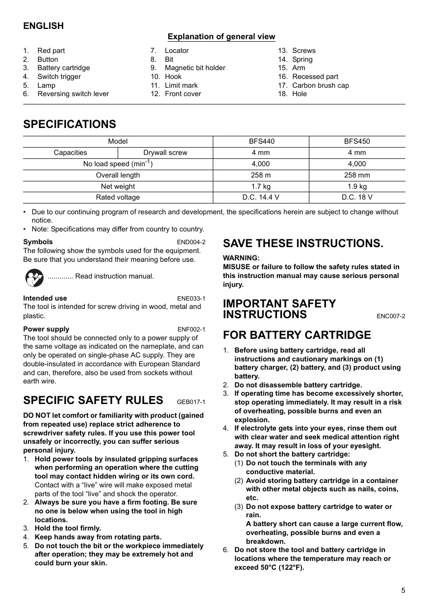 1. Red part 7. Locator 13. Screws 2. Button 8. Bit 14. Spring 3. Battery cartridge 9. Magnetic bit holder 15. Arm 4. Switch trigger 10. Hook 16. Recessed part 5. Lamp 11. Limit mark 17. Carbon brush cap 6. Reversing switch lever 12. Front cover 18. Hole SPECIFICATIONS Model BFS440 BFS450 Capacities I Drywall screw 4 mm 4 mm No load speed (min?) 4,000 4,000 Overall length 258 m 258 mm Net weight 17kg 12 kg Rated voltage D.C. 144V DC.18V