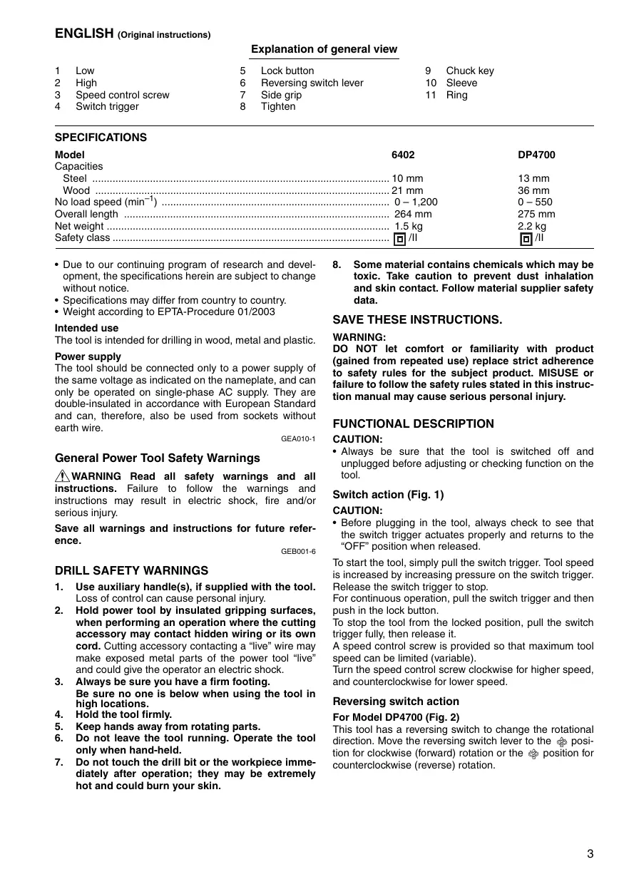 ENGLISH (original instructions) Explanation of general view 1 Low 5 Lock button 9 Chuckkey 2 High 6 Reversing switch lever 10 Sleeve 3 Speed control screw 7 Side grip 11 Ring 4 Switch trigger 8 Tighten SPECIFICATIONS Model 6402 DP4700 Capacities Steel 10 mm 13mm Wood 21 mm 36 mm No load speed (min” 01,200 0-550 Overall length 264 mm 275 mm Net weight 1.5 kg 22kg Safety class [Li CL + Due to our continuing program of research and devel- opment, the specifications herein are subject to change without notice. + Specifications may differ from country to country. + Weight according to EPTA-Procedure 01/2003 intended use The tool is intended for drilling in wood, metal and plastic. Power supply The tool should be connected only to a power supply of the same voltage as indicated on the nameplate, and can only be operated on single-phase AC supply. They are double-insulated in accordance with European Standard and can, therefore, also be used from sockets without earth wire. GEAoto4 General Power Tool Safety Warnings A\WARNING Read all safety warnings and all instructions. Failure to follow the warnings and instructions may result in electric shock, fire and/or serious injury. Save all warnings and instructions for future refer- ence. GEBoo.s
