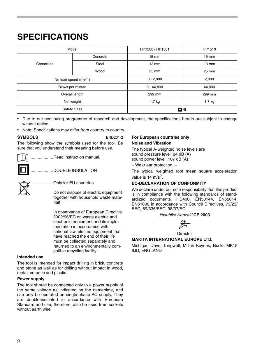 - Note: Specifications may differ from country to country. SYMBOLS END201-2 The following show the symbols used for the tool. Be sure that you understand their meaning before use. ...................Read instruction manual. ...................DOUBLE INSULATION ..................Only for EU countries Do not dispose of electric equipment together with household waste material! In observance of European Directive 2002/96/EC on waste electric and electronic equipment and its implementation in accordance with national law, electric equipment that have reached the end of their life must be collected separately and returned to an environmentally compatible recycling facility. Intended use The tool is intended for impact drilling in brick, concrete and stone as well as for drilling without impact in wood, metal, ceramic and plastic. Power supply The tool should be connected only to a power supply of the same voltage as indicated on the nameplate, and can only be operated on single-phase AC supply. They are double-insulated in accordance with European Standard and can, therefore, also be used from sockets without earth wire.