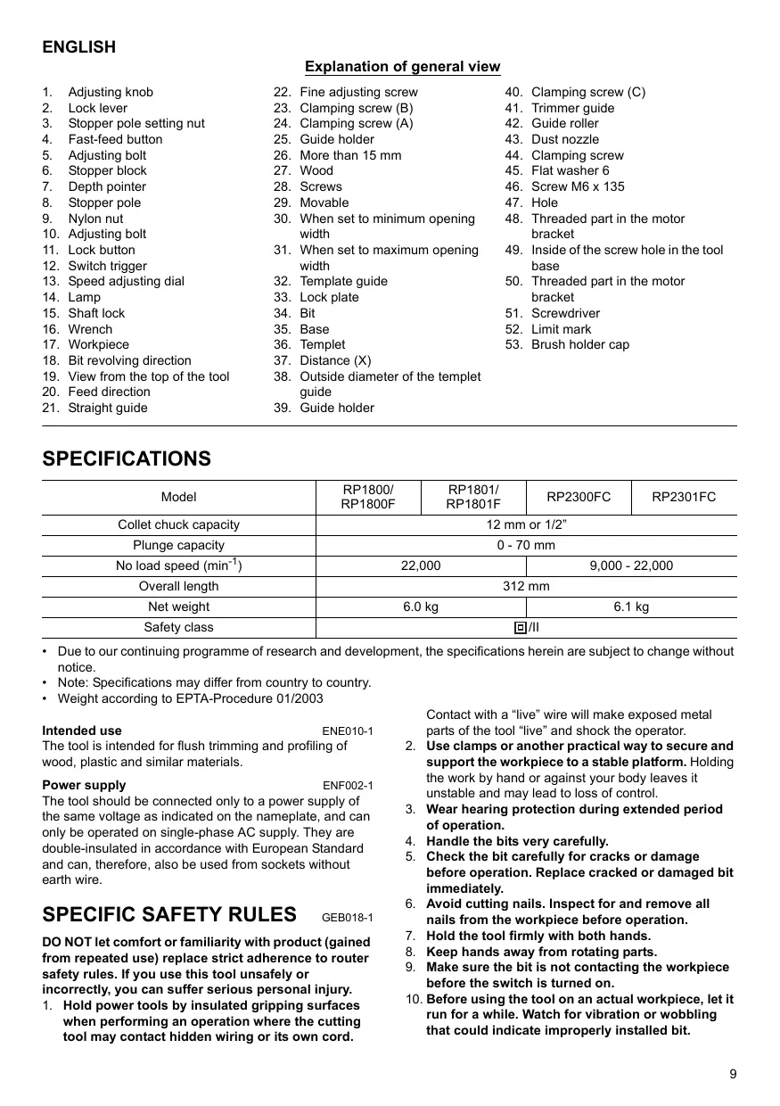 5. Perno de ajuste 25. Soporte de la guia 42. Rodillo guia 6. Bloque de tope 26. Més de 15 mm 43. Boquilla de polvo 7. Indicador de profundidad 27. Madera 44. Tomillo de apriete 8. Varilla de tope 28. Tornillos 45. Arandela plana 6 9. Tuerca de nylon 29. Môvil 46. Torillo M6 x 135 10. Perno de ajuste 30. Cuando se ajusta en el ancho de 47. Orificio 11. Botôn de bloqueo apertura minimo 48. Parte con rosca del soporte del 12. Interruptor disparador 31. Cuando se ajusta en el ancho de motor 13. Dial de regulaciôn de la velocidad apertura mäximo 49. Interior del orificio para el tomill 14. Lämpara 32. Guia para plantilla de la base de la herramienta 15. Bloqueo del eje 33. Placa de bloqueo 50. Parte con rosca del soporte del 16. Liave 34. Fresa motor 17. Pieza de trabajo 35. Base 51. Destornillador 18. Direcciôn de giro de la fresa 36. Plantila 52. Marca de limite 19. Vista desde la parte superior de la 37. Distancia (X) 53. Tapa del portaescobillas herramienta ESPECIFICACIONES RP1800/ RP1801/ Modelo RP 1800 RPABOIE RP2300FC RP2301FC Capacidad de boquilla 12 mm o 12° Capacidad de penetraciôn 0-70 mm Velocidad en vacio (min 1) 22.000 Ï 9.000 - 22.000 Observe si se producen vibraciones u oscilaciones, puesto que son sintomas de que la fresa no se ha instalado correctamente.
