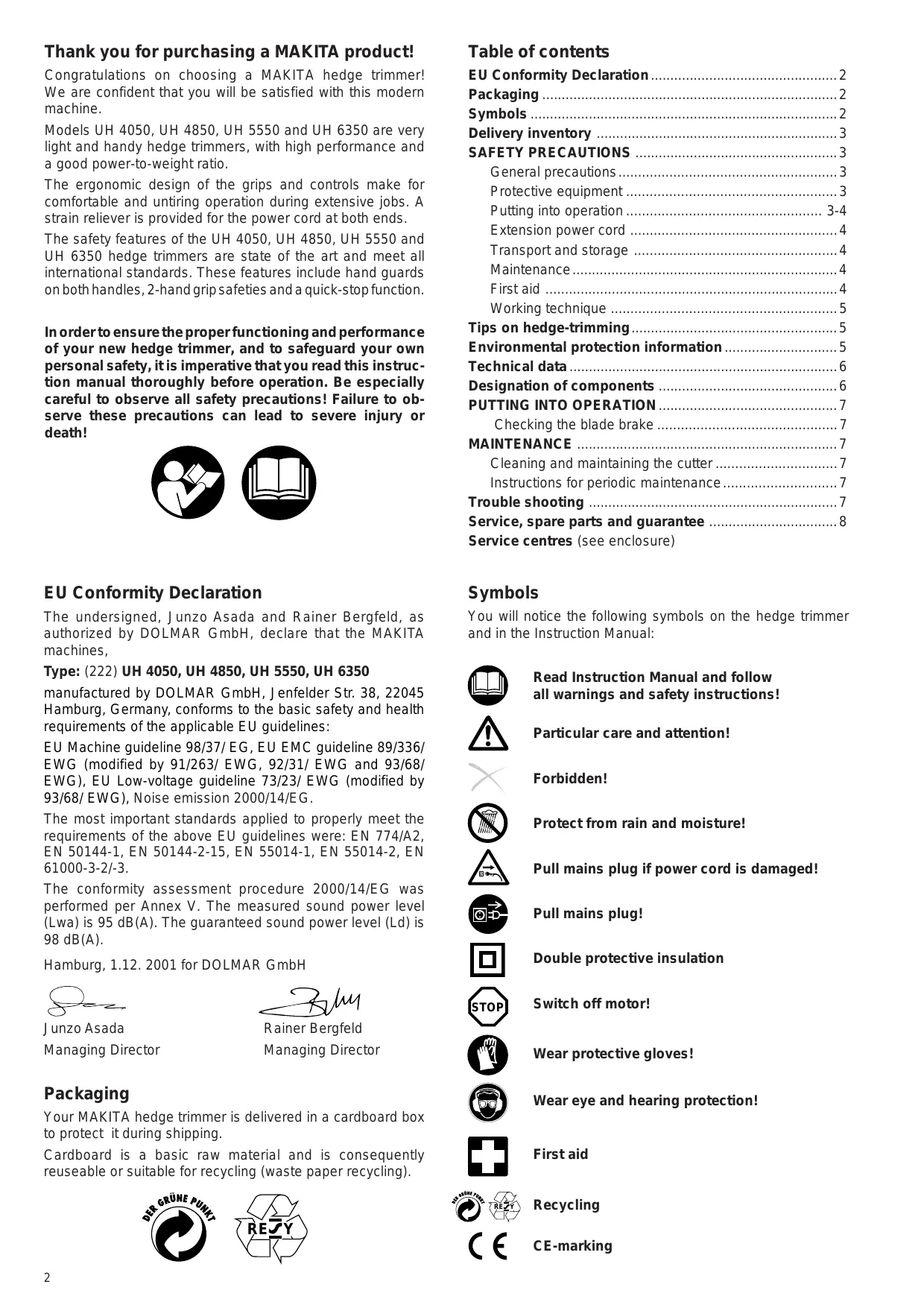 UH 4050 UH 4850 UH 5550 UH 6350 Important: Read this instruction manual carefully before putting the hedge trimmer into operation and strictly observe the safety regulations! Keep this instruction manual! Thank you for purchasing a MAKITA product! Table of contents Congratulations on choosing a MAKITA hedge trimmer! We are confident that you will be satisfied with this modern machine. Models UH 4050, UH 4850, UH 5550 and UH 6350 are very light and handy hedge trimmers, with high performance and a good power-to-weight ratio. The ergonomic design of the grips and controls make for comfortable and untiring operation during extensive jobs. A strain reliever is provided for the power cord at both ends. The safety features of the UH 4050, UH 4850, UH 5550 and UH 6350 hedge trimmers are state of the art and meet all international standards. These features include hand guards on both handles, 2-hand grip safeties and a quick-stop function. In order to ensure the proper functioning and performance of your new hedge trimmer, and to safeguard your own personal safety, it is imperative that you read this instruction manual thoroughly before operation. Be especially careful to observe all safety precautions! Failure to observe these precautions can lead to severe injury or death! EU Conformity Declaration Symbols The undersigned, Junzo Asada and Rainer Bergfeld, as authorized by DOLMAR GmbH, declare that the MAKITA machines, You will notice the following symbols on the hedge trimmer and in the Instruction Manual: Read Instruction Manual and follow all warnings and safety instructions! manufactured by DOLMAR GmbH, Jenfelder Str. 38, 22045 Hamburg, Germany, conforms to the basic safety and health requirements of the applicable EU guidelines: Particular care and attention! EU Machine guideline 98/37/ EG, EU EMC guideline 89/336/ EWG (modified by 91/263/ EWG, 92/31/ EWG and 93/68/ EWG), EU Low-voltage guideline 73/23/ EWG (modified by 93/68/ EWG), Noise emission 2000/14/EG. Forbidden! The most important standards applied to properly meet the requirements of the above EU guidelines were: EN 774/A2, EN 50144-1, EN 50144-2-15, EN 55014-1, EN 55014-2, EN 61000-3-2/-3. Protect from rain and moisture! Pull mains plug if power cord is damaged! The conformity assessment procedure 2000/14/EG was performed per Annex V. The measured sound power level (Lwa) is 95 dB(A). The guaranteed sound power level (Ld) is 98 dB(A). Double protective insulation STOP Junzo Asada Rainer Bergfeld Managing Director Managing Director Switch off motor! Wear protective gloves! Packaging Wear eye and hearing protection! Your MAKITA hedge trimmer is delivered in a cardboard box to protect it during shipping. First aid Cardboard is a basic raw material and is consequently reuseable or suitable for recycling (waste paper recycling). RE Y Recycling RE Y CE-marking