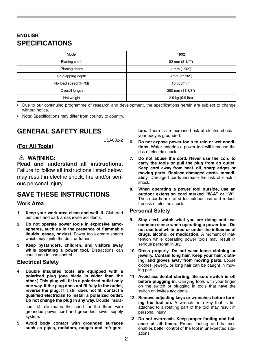 - Note: Specifications may differ from country to country. tors. There is an increased risk of electric shock if your body is grounded. USA002-2 (For All Tools)